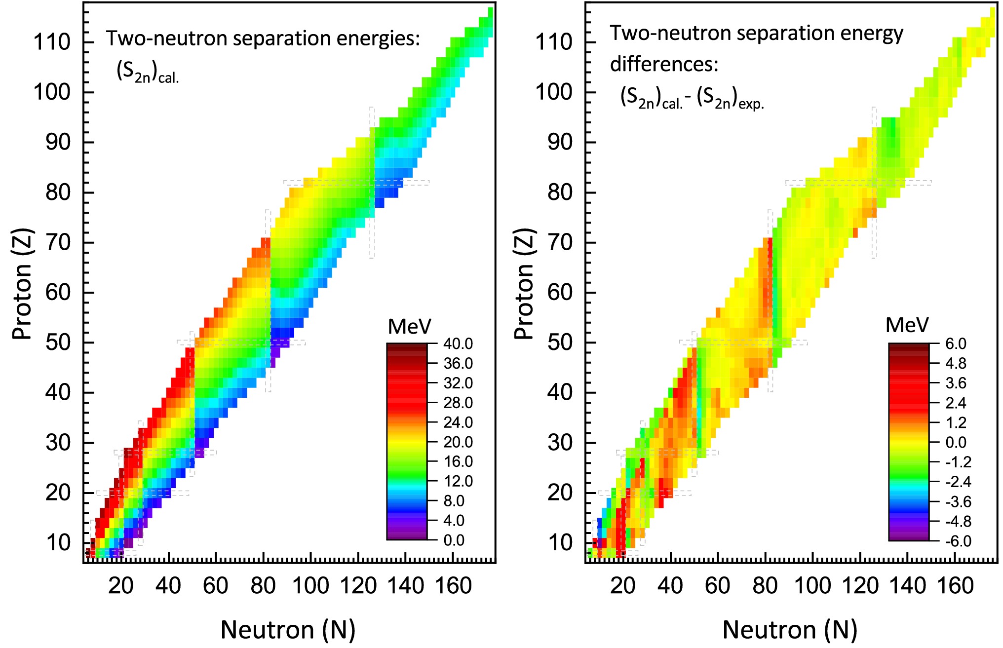 $ S_{2n} $ and$ S_{2p} $ ) offer essential insights into the investigation of neutron and proton drip lines, nuclear shell evolution, and nucleon radioactivity phenomena [123]. They can be expressed as:$ \begin{aligned}[b] S_{2n}(A,Z)=&B(A,Z)-B(A-2,Z),\\ S_{2p}(A,Z)=&B(A,Z)-B(A-2,Z-2), \end{aligned} $