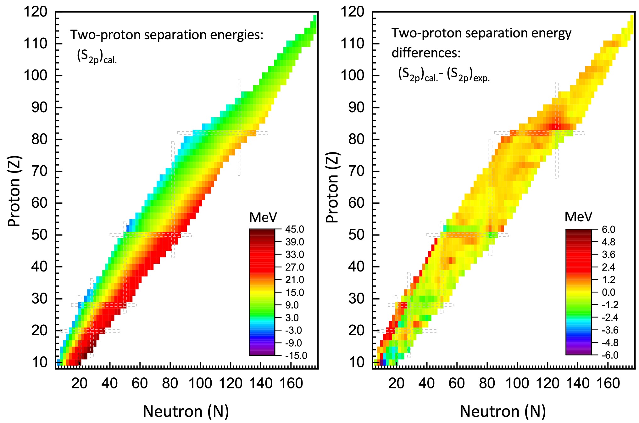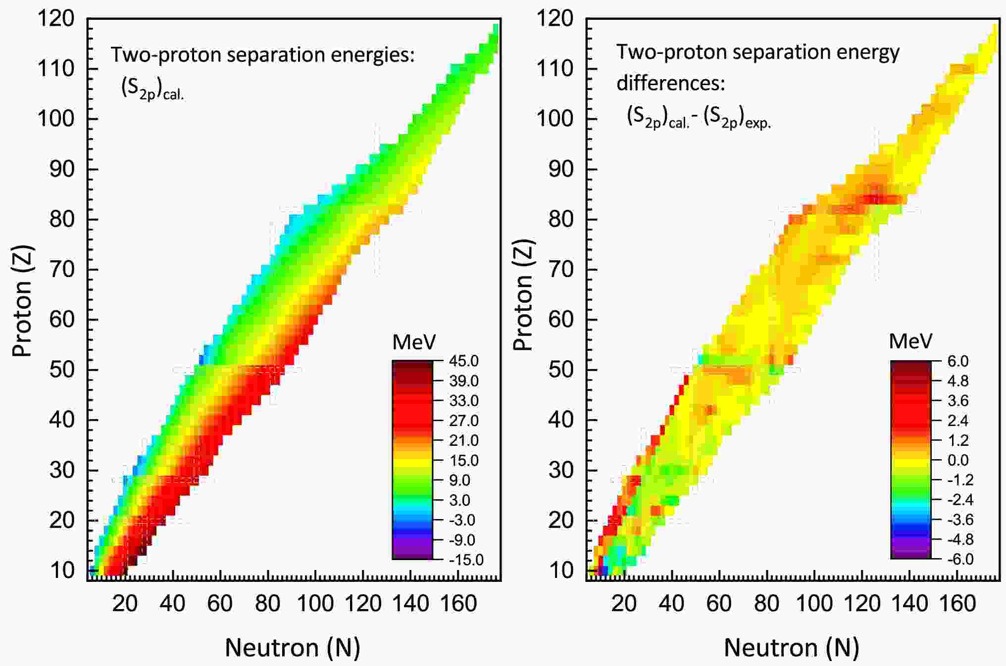 $ S_{2p} $ ) for even-even nuclei, accompanied by the differences between theoretical predictions and experimental measurements. In contrast to the two-neutron separation energy ($ S_{2n} $ ), for a given isotopic chain,$ S_{2p} $ exhibits an increasing trend with neutron number, while in isotonic chains, it demonstrates a decreasing trend with proton number. Furthermore, the data indicate a gradual reduction in$ S_{2p} $ values within neutron-rich regions as the proton number increases. The right panel of Fig. 5 demonstrates that the majority of theoretical-experimental deviations fall within a range of$ \pm2 $ MeV. For the nuclei under investigation, the rms deviation of$ S_{2p} $ between theory and experiment is calculated to be 0.848 MeV, indicating acceptable agreement between theoretical predictions and experimental observations.Figure 5. (color online) Left: Theoretical predictions of two-proton separation energies for even-even nuclei obtained from IQMDD3 calculations. Right: The discrepancy between theoretical calculations and experimental measurements of the two-proton separation energies.