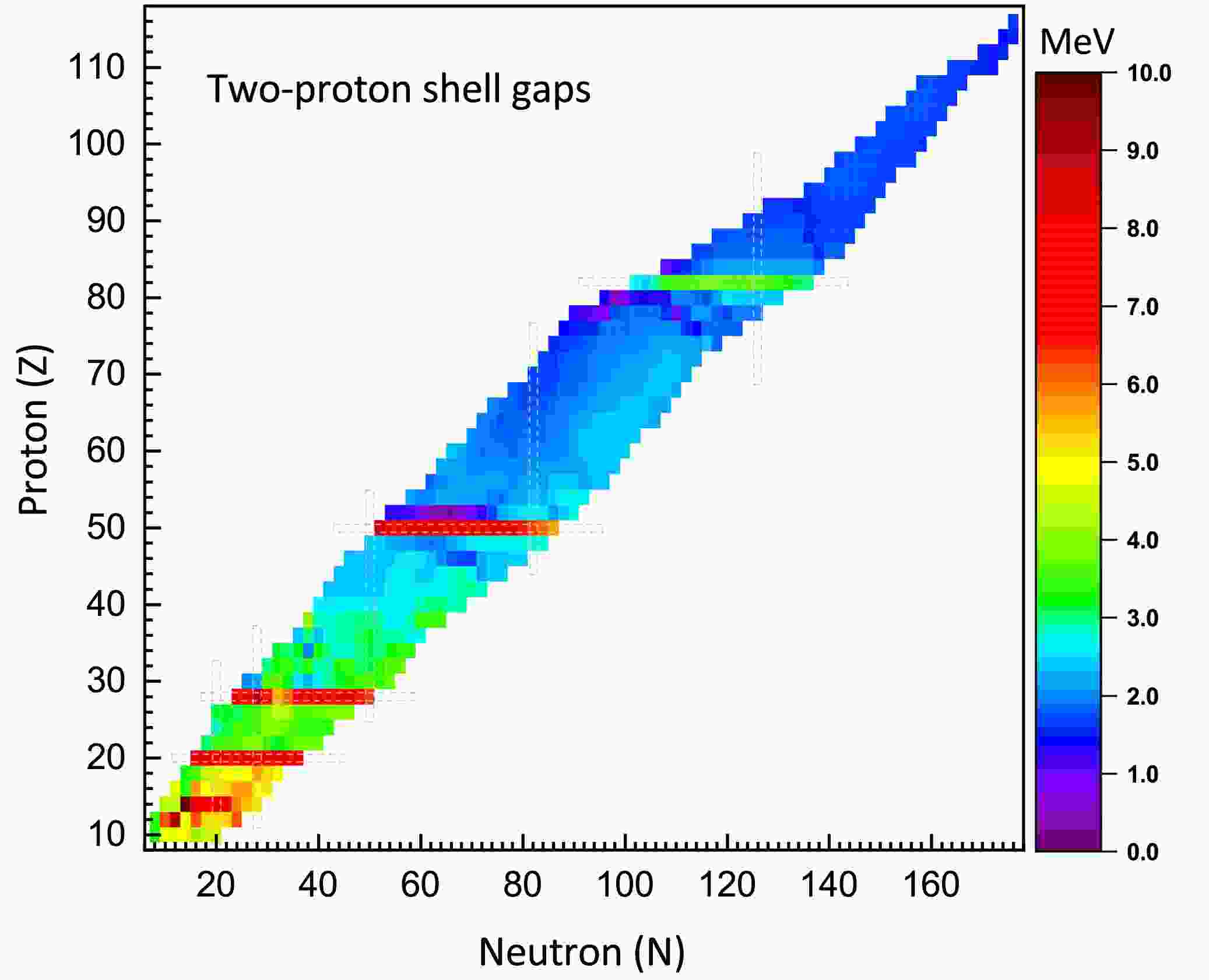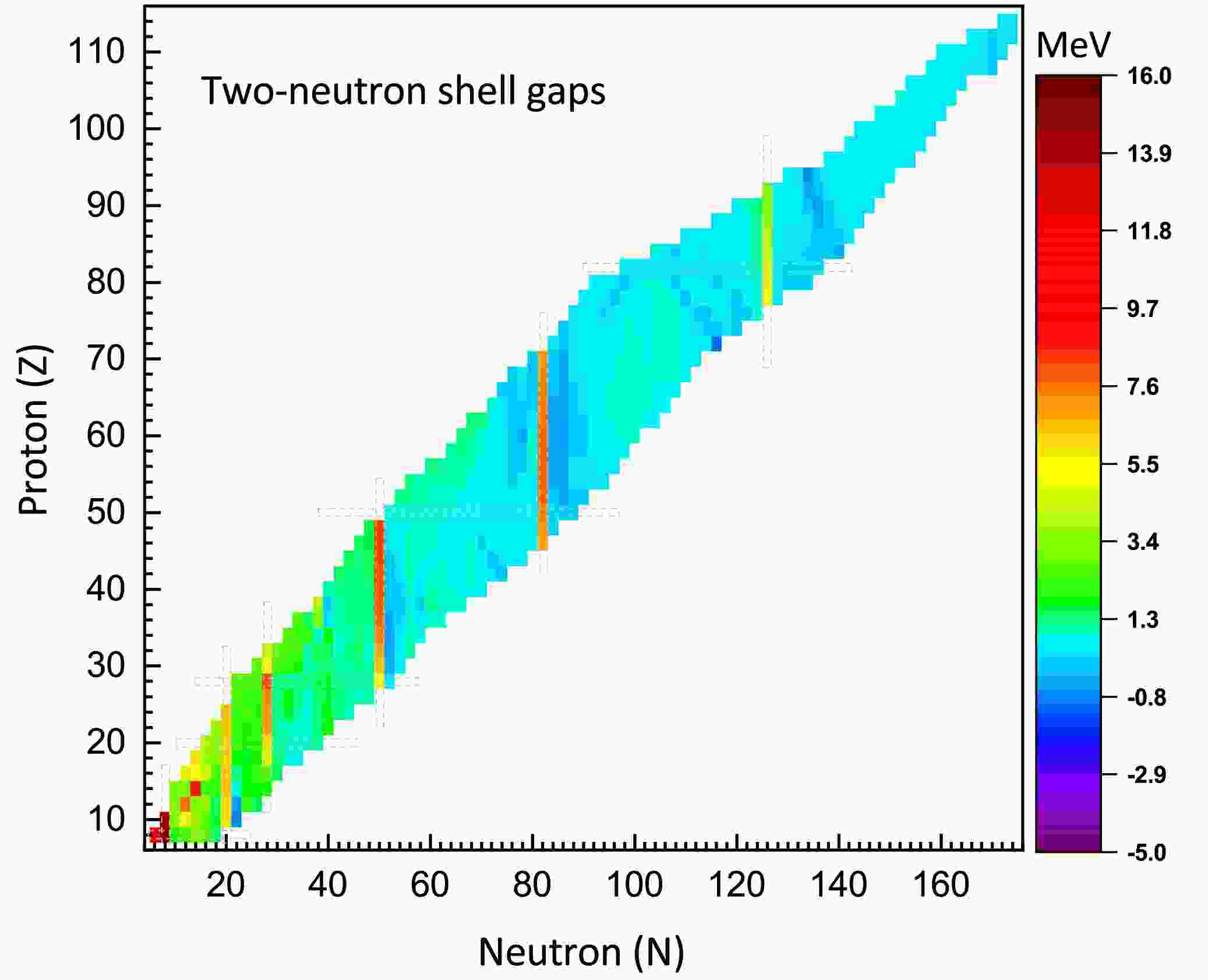 $ \delta_{2n} $ ) for even-even nuclei in the region of$ 8\leq Z\leq114 $ . It is shown that$ \delta_{2n} $ exhibits significant sharp changes at neutron numbers N=8, 20, 28, 50, 82, and 126, which can be regarded as one of the signatures of magic numbers. For the magic number N=28,$ \delta_{2n} $ becomes relatively small in both proton-rich and neutron-rich regions, suggesting that the N=28 shell closure may be quenched in these areas.Figure 6. (color online) Two-neutron shell gaps