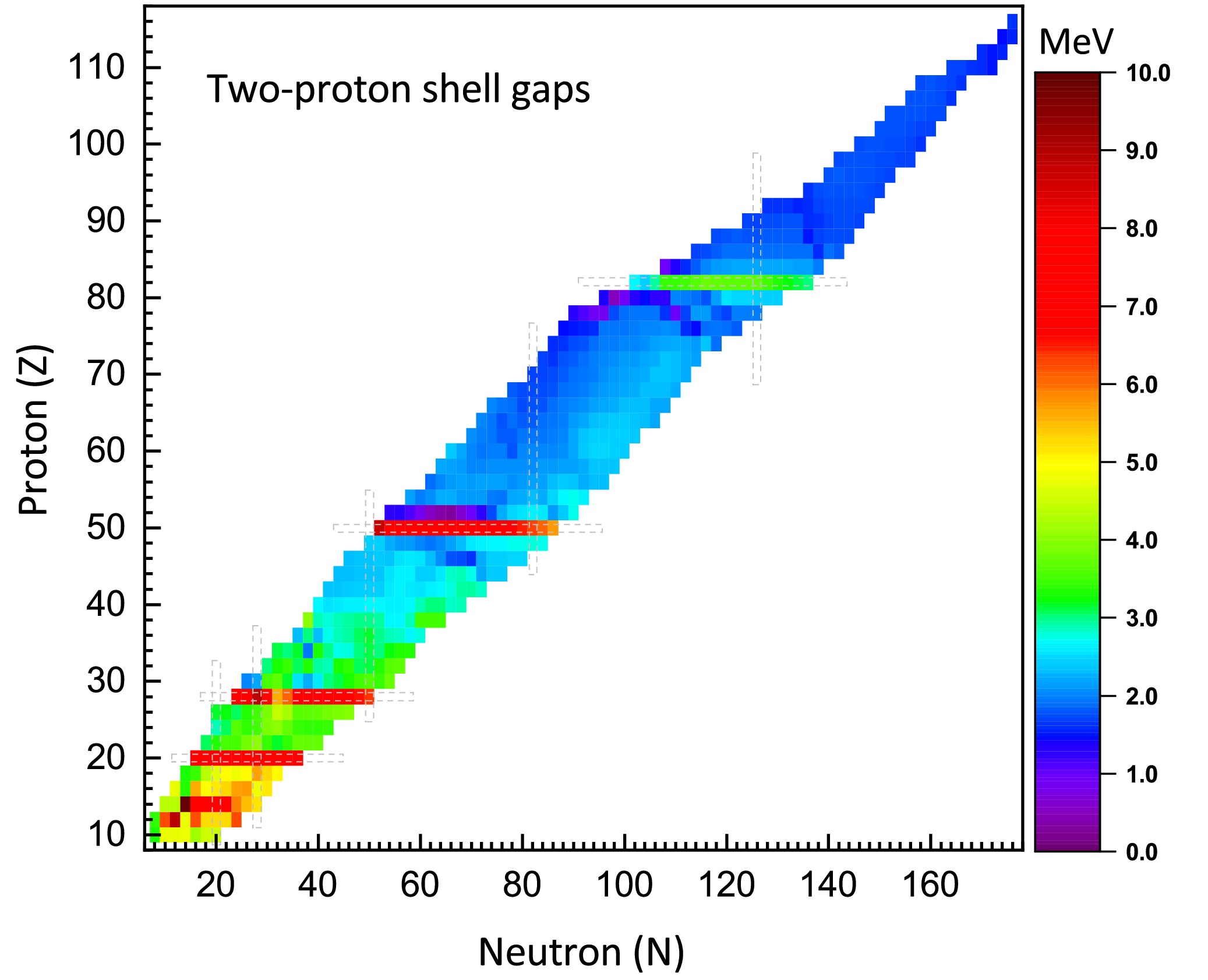 $ \delta_{2n} $ for even-even nuclei, as calculated with the IQMDD3 parameterization.Fig. 7 presents the two-proton gaps (