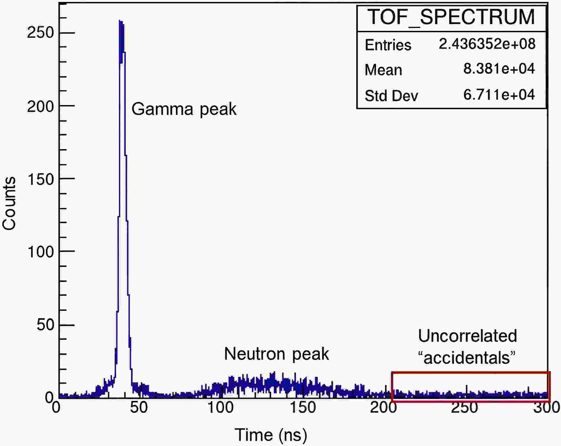 Figure 11. (color online) Initial time-of-flight spectrum measured by the EJ-309 detector; the red box indicates signals recorded due to random coincidences.