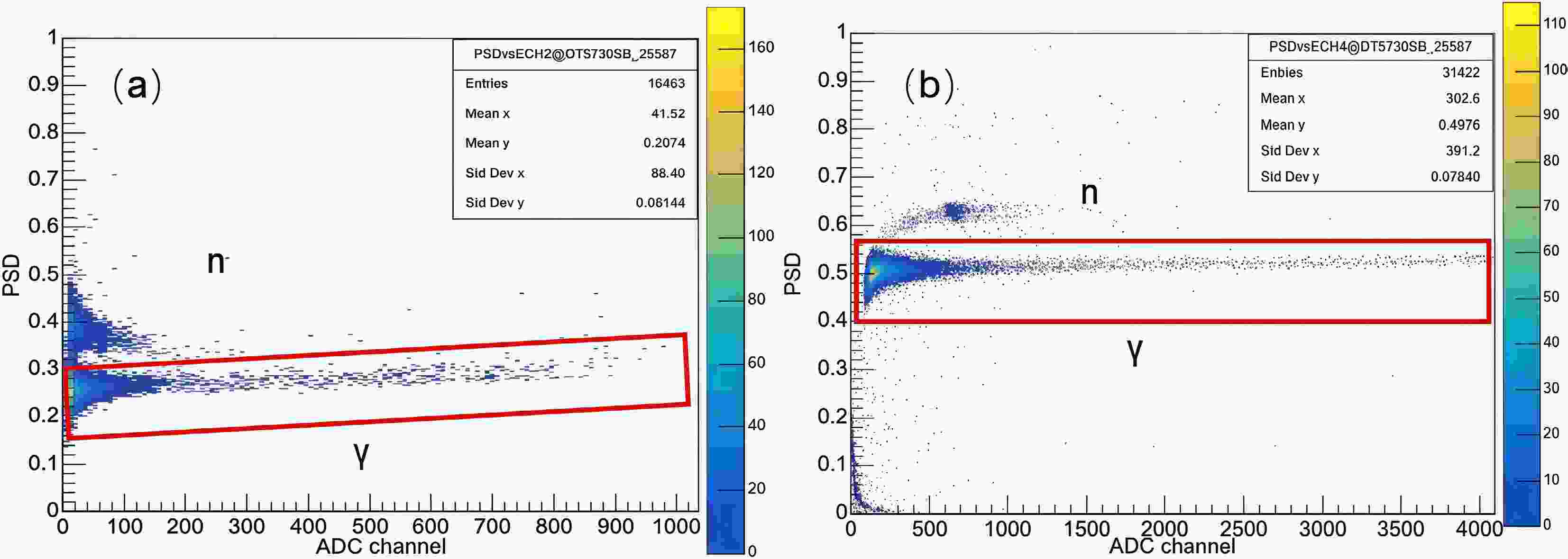 Figure 12. (color online) PSD (Pulse Shape Discrimination) plots obtained during TOF spectrum measurements, clearly showing γ events: (a) EJ-309 detector; (b) CLYC detector.