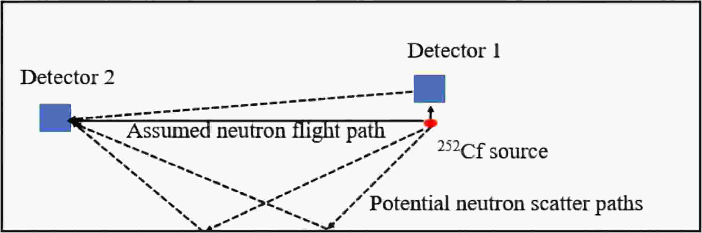 The third background component is a time-correlated neutron background, primarily arising from scattered neutrons. As illustrated in Fig.13, neutrons produced by fission can undergo scattering interactions with surrounding structural materials. These scattered neutrons may enter Detector 2 (the neutron detector), resulting in time-correlated background signals. Due to energy loss during neutron-matter interactions, the energy of secondary neutrons decreases progressively, leading to an increase in the number of low-energy neutrons. This causes a gradual rise in background counts and produces a sloped background trend in the TOF spectrum.