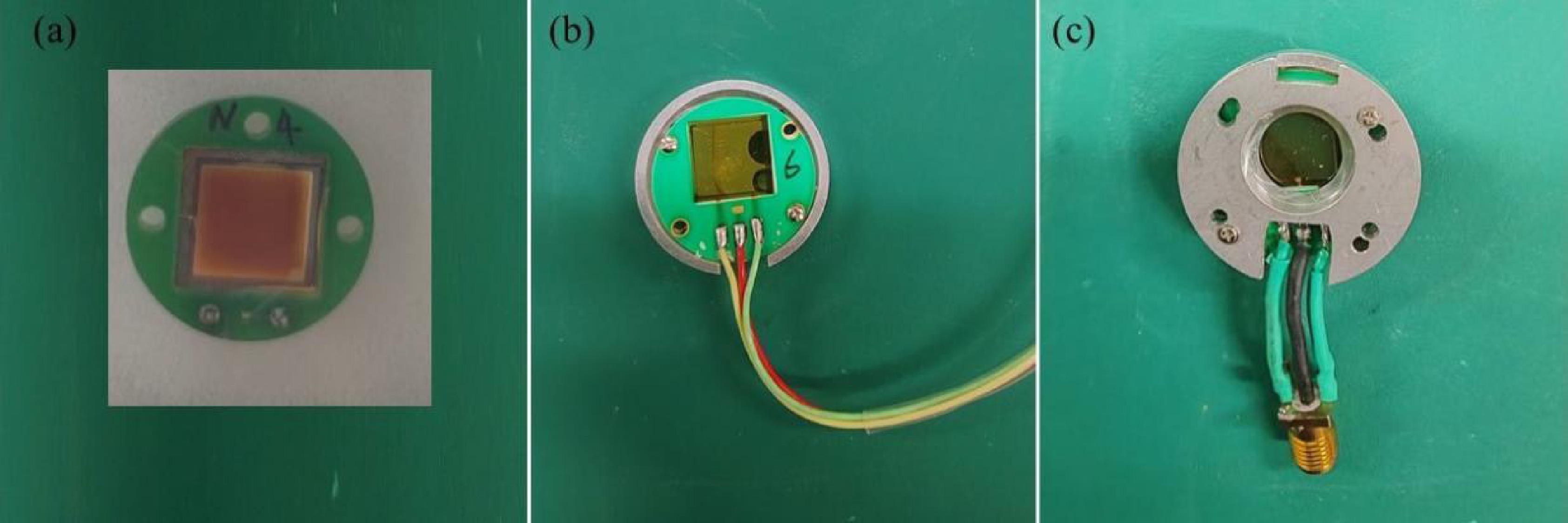 Figure 3. (color online) Photographs of the silicon carbide (SiC) detector:(a) Newly fabricated SiC detector; (b) Signal cable being soldered to the detector; (c) Detector placed inside a custom-made aluminum housing, with the circular area at the top designated for the neutron source.