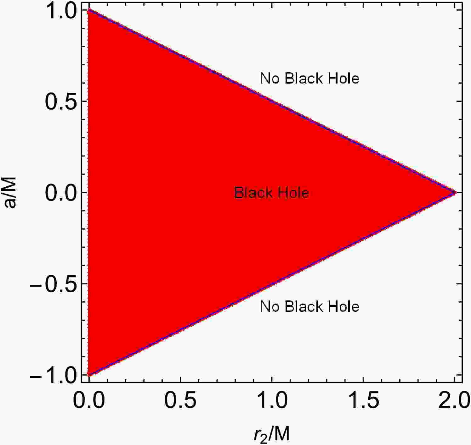$ a^{2} \leqslant \left(M - \dfrac{r_2}{2}\right)^{2} $ . This relation confines the parameters to the range$ 0 \leqslant \dfrac{r_2}{M} \leqslant 2\left(1 - \dfrac{a}{M}\right) $ . Given that the spin parameter a must always remain smaller than or equal to the BH mass M, the resulting physically viable interval for the dilaton parameter is restricted to$ 0 \leqslant \dfrac{r_2}{M} \leqslant 2 $ .Figure 1 shows that the shaded domain marks the range of parameters producing regular BHs (