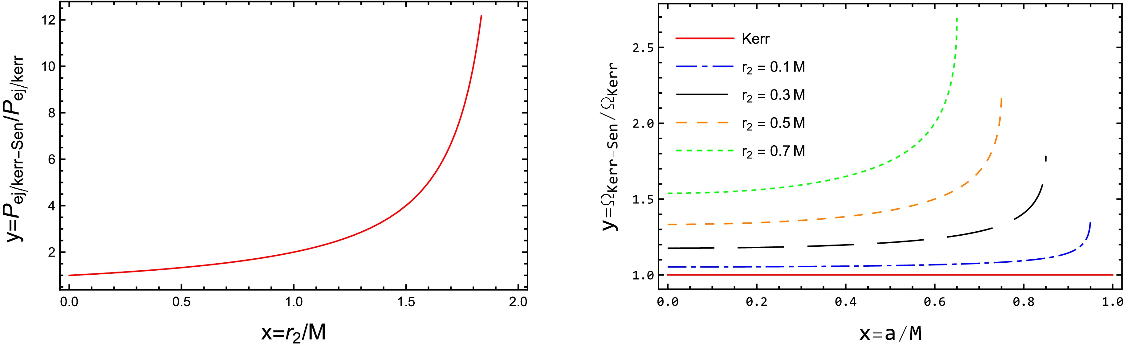 $ r_2 $ . The right graph depicts the ratio of angular velocity for a fixed$ r_2 $ as a function of spin a.Additionally, the energy extraction efficiency can be expressed as [3]
