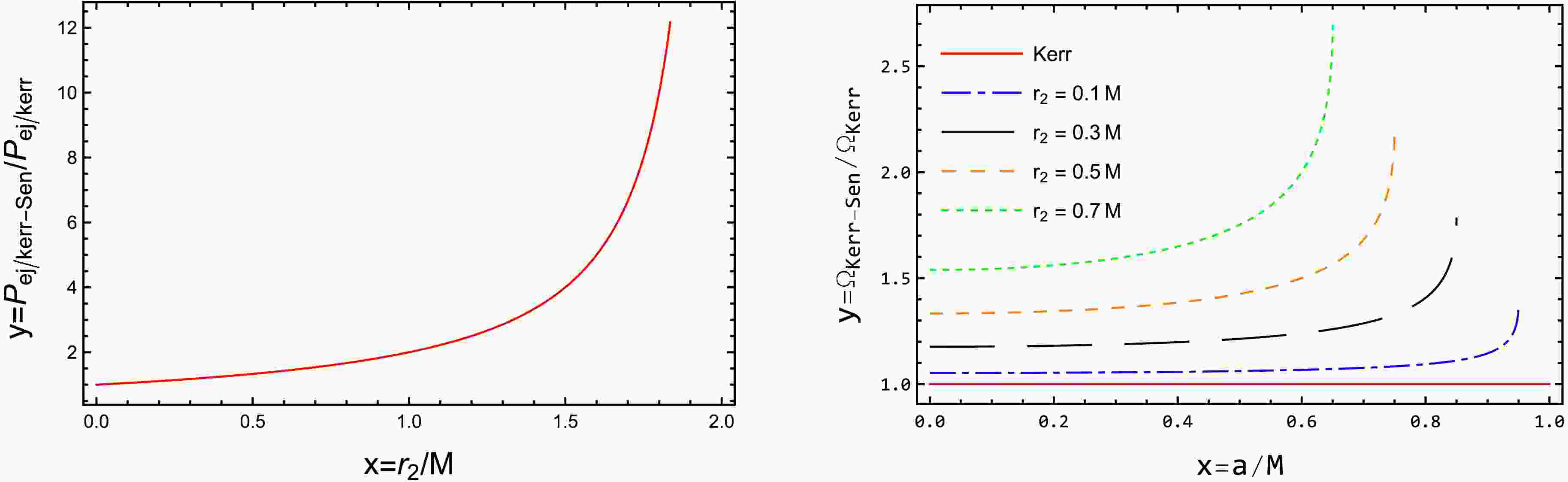 $ \Omega^{(1)}_{H}=\dfrac{a}{2M(2M-r_2)} $ is one-order angular velocity. It is obvious that this result converges to the Kerr BH when the dilation parameter tends to zero. Furthermore, it is noteworthy that in the context of first-order perturbation, the expression$ \Omega = \dfrac{\Omega_{H}}{2} $ approximately aligns with the behavior exhibited by the Kerr BH. Subsequently, we plotted the ratio of two BH extraction rates. The top-left panel in Fig. 2 shows the radio of$ P_{\rm{BZ}} $ from different BHs as a function of$ r_2 $ . We observe that within the theoretical range, as the dilaton parameter$ r_2 $ increases, the Kerr-Sen BH extract several times more energy compared to Kerr BH. In the top-right panel of Fig. 2, the ratio of angular velocitie between the two BHs is presented. We find that the angular velocity is sensitive to the dilaton parameter, specifically showing an upward trend as$ r_2 $ increases for a given spin a.