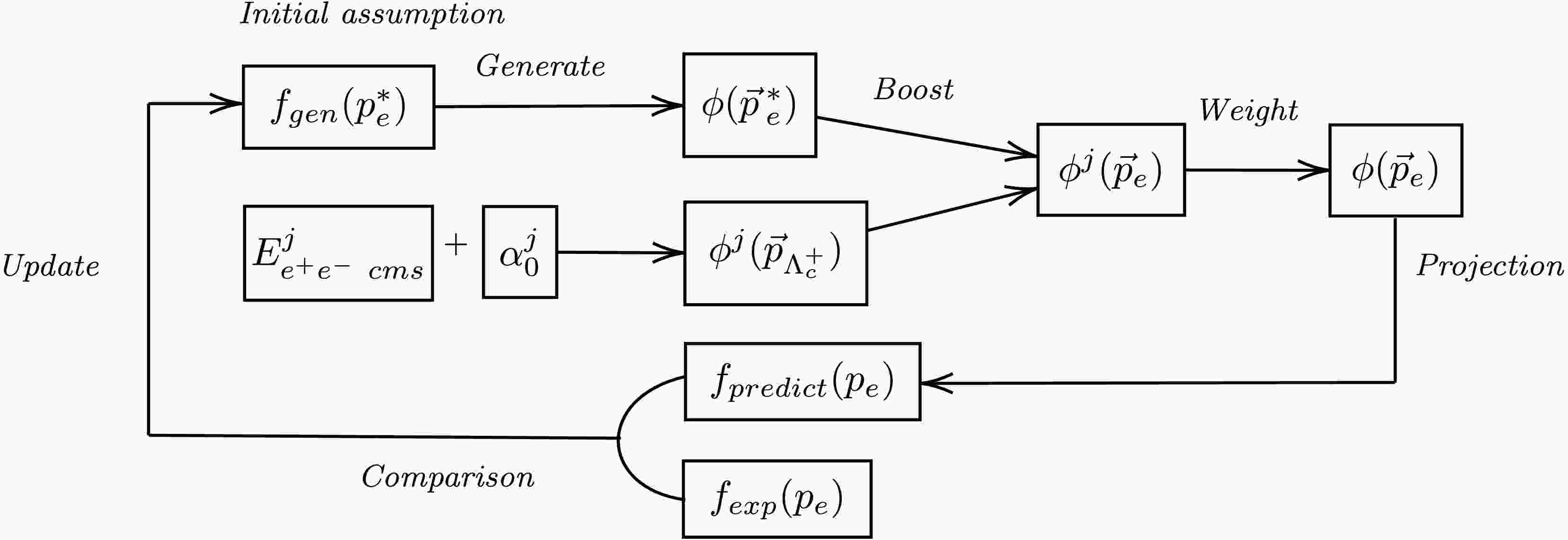 $ \Lambda_c^+ $ rest-frame): An electron momentum,$ p^*_e $ , is randomly sampled from the current hypothesis for the "origin" spectrum,$ f_{gen} (p^*_e) $ . A four-momentum is then constructed assuming isotropic decay in the$ \Lambda_c^+ $ rest-frame, distributed as$ \phi (\vec{p}\,^{*}_{e}) $ .4. Transformation to lab-frame: The electron's four-momentum is then Lorentz-boosted from the