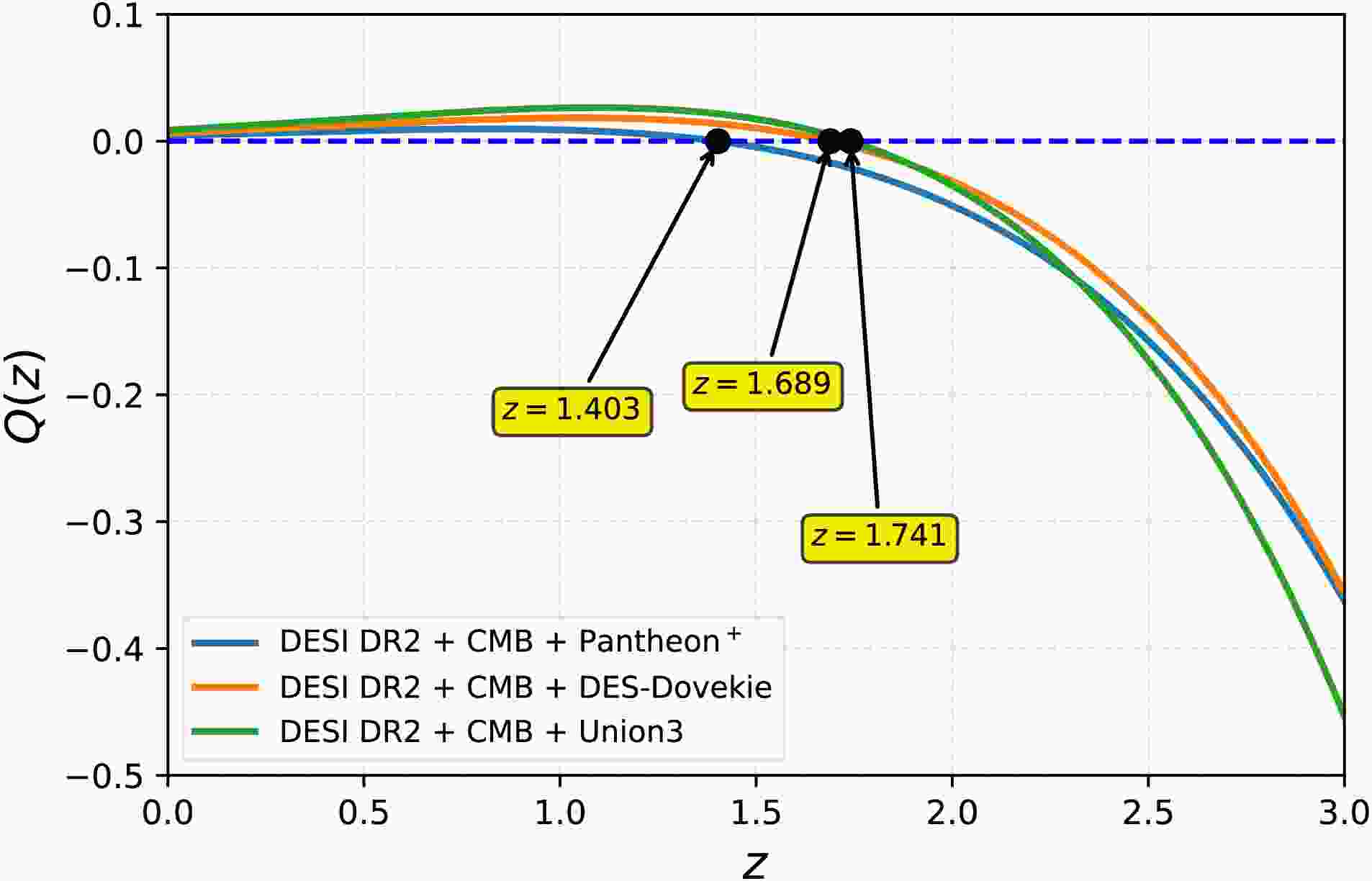 $ Q(z) $ for each dataset combination. In all cases, the interaction term is positive at low redshift, meaning vacuum decaying into dark matter. As the redshift increases, each dataset predicts a distinct transition redshift at which$ Q(z) $ changes sign from positive to negative. Specifically, the zero crossing occurs at$ z = 1.74 $ for CMB+DESI+Pantheon+, at$ z = 1.68 $ for CMB+DESI DR2+DES-Dovekie, and at$ z = 1.40 $ for CMB+DESI DR2+Union3. The negative interaction terms correspond to a decay of dark matter into the vacuum sector. This characteristic sign change is due to the fact that the$ \Lambda(t){\rm{CDM}} $ model predicts$ \beta < 0 $ and$ \alpha' > 0 $ in each combination.