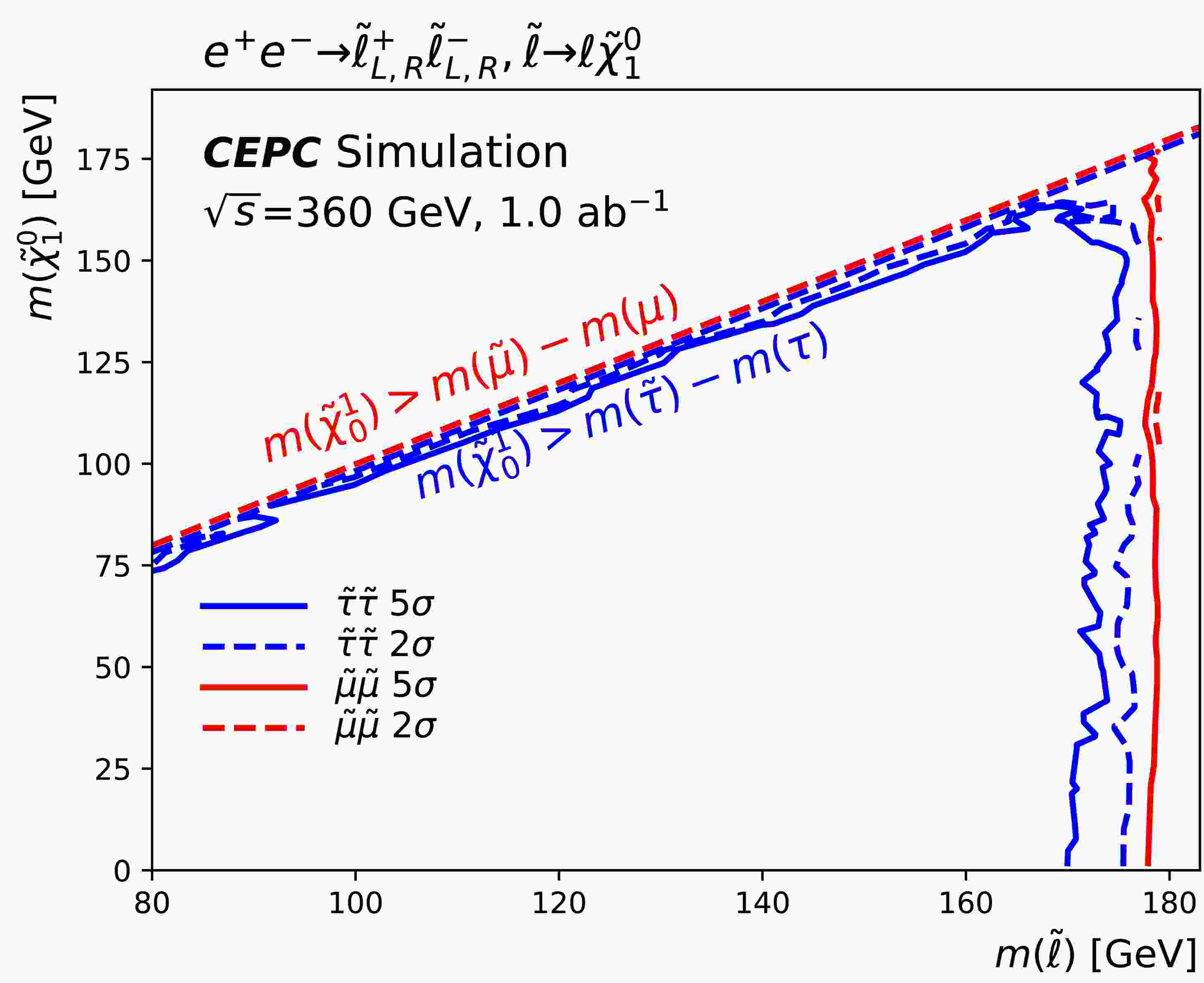 $\tilde{\tau}$ and$\tilde{\mu}$ production, assuming a 5% flat systematic uncertainty. For direct stau production, the discovery reach extends up to 170 GeV in stau mass for the combined left- and right-handed scenario, with respective reaches of 169 GeV and 162 GeV for purely left-handed and right-handed staus. For direct smuon production, the discovery potential reaches up to 178 GeV in smuon mass. Given the similar design and performance characteristics of future$e^+e^-$ collider facilities, these results serve as a valuable reference for other proposed experiments with comparable center-of-mass energies and target luminosities, such as the ILC [34] and FCC-ee [35]. -