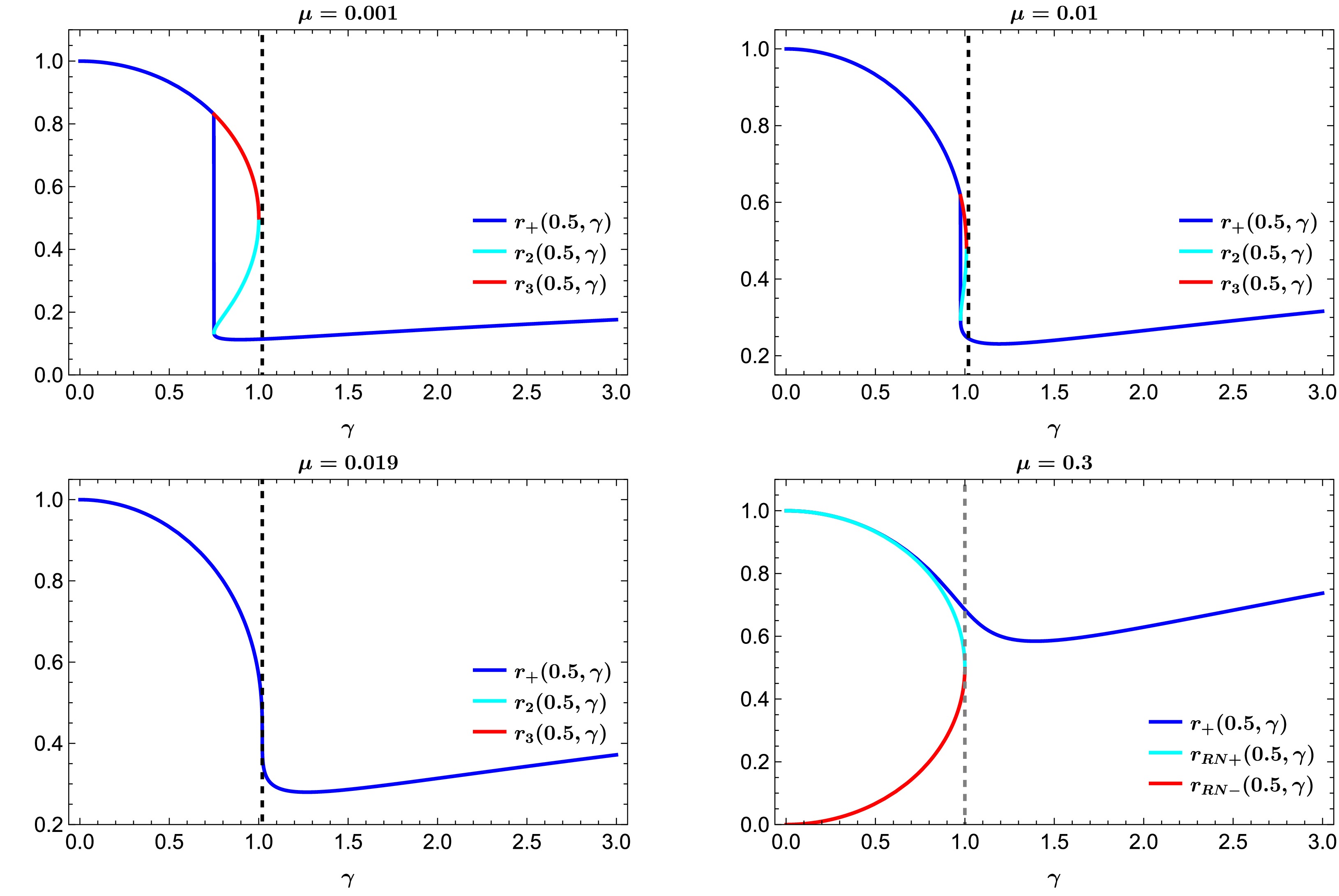 $ \gamma=1.02 $ . In the EEH black hole, three distinct real positive horizons exist only when$ \mu \lesssim 0.019 $ , as shown in the top and bottom-left figures. When a single horizon exists$ \mu \gt 0.019 $ , its size is compared with that of a RN black hole of the same ADM mass ($ M=0.5 $ ) in the bottom-right figure.Hereafter, we fix the EH parameter