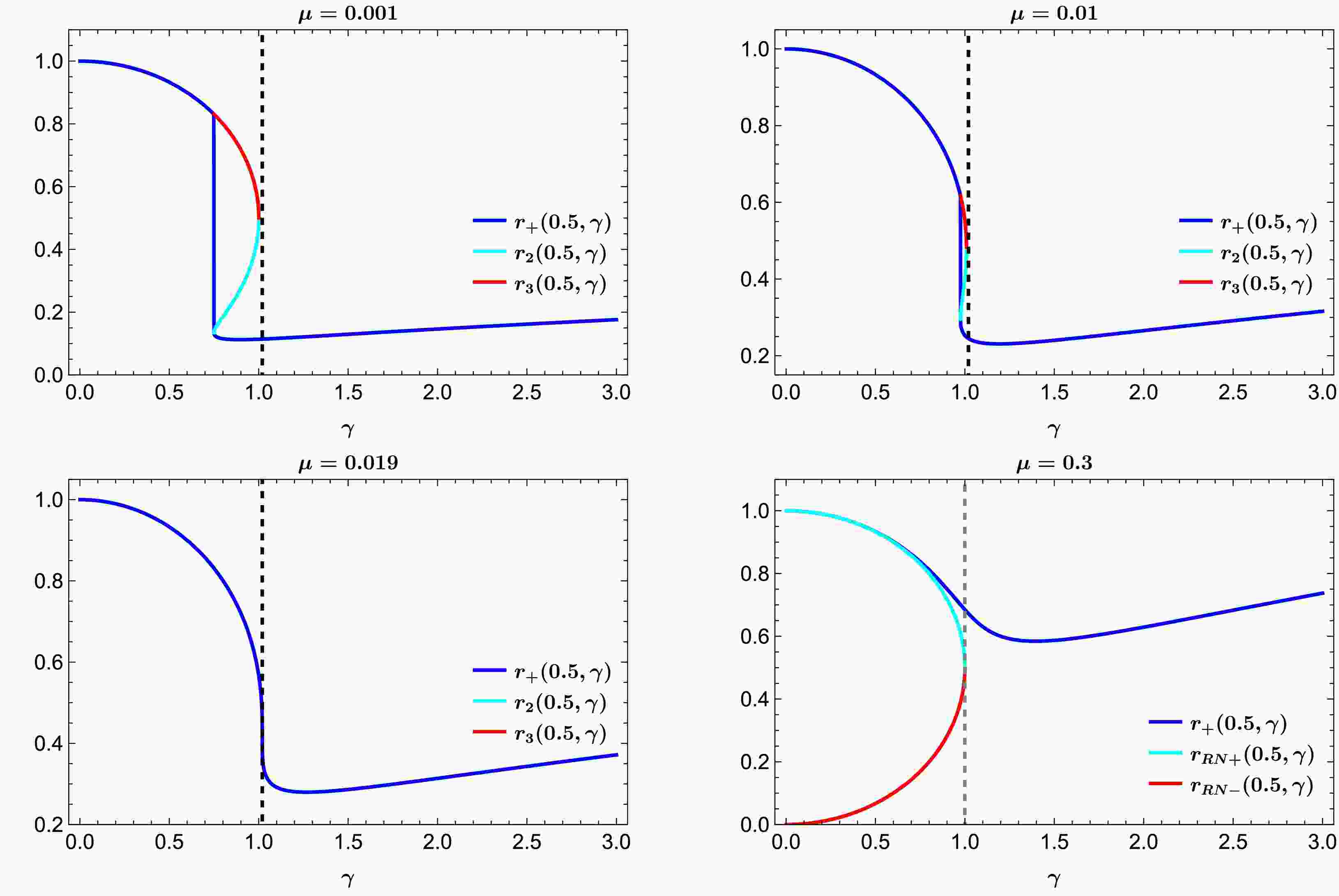 $ M=0.5 $ is fixed, the square root in$ x_2 $ requires$ 0 \lt \gamma \lesssim 1.02 $ . Since$ x_1 + x_2 $ increases with increasing γ, the parameter μ reaches its maximum value,$ \mu_{\max} \sim 0.019 $ , at$ \gamma \sim 1.02 $ , corresponding to the point where two roots become degenerate. Therefore, three real positive roots exist only when the charge-to-mass ratio satisfies$ 0 \lt \gamma \lesssim 1.02 $ . If μ exceeds$ \mu_{\max} \sim 0.019 $ , then only a single real positive root exists for all values of γ. This corresponds to the case where the charge-to-mass ratio is unbounded, in sharp contrast to the RN black hole ($ \mu = 0 $ , i.e., without QED effects), which possesses outer and inner horizons given by$ r_{{\rm{RN}}\pm}(M, q) = M \pm \sqrt{M^2 - q^2} $ . As demonstrated in Fig. 1, we set$ \mu=0.001, 0.01, 0.19 $ , and$ 0.3 $ as examples to illustrate this relationship.