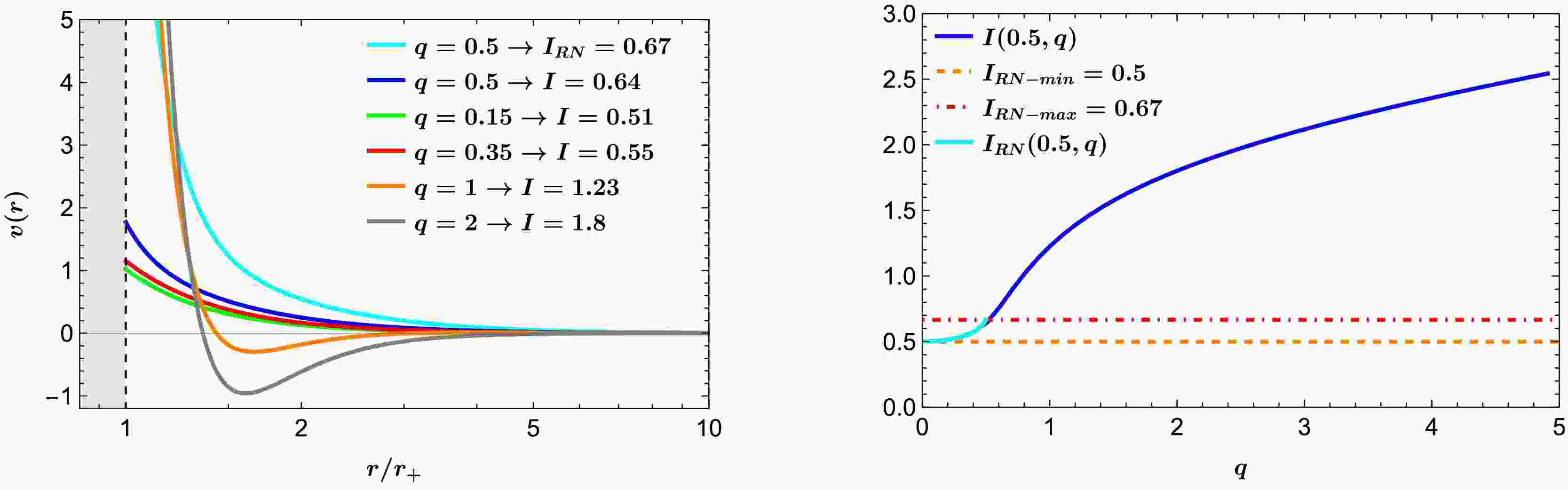 $ v(r,M,q) $ and its integration$ I(M,q) $ . (Left) Five q-dependent potentials$ v(r,M=0.5,q) $ as functions of$ r/r_{+} $ with$ q=0.15,0.35,0.5,1,2 $ . Negative regions appear near the horizon for$ q>0.5 $ . However,$ v_{\rm{RN}}(r,0.5,q) $ is a positive function of$ r\in[r_{\rm RN+},\infty] $ for$ q\in[0,0.5] $ . (Right) Integration$ I(0.5,q) $ as a function of q. Its lower limit is 0.5 at$ q=0.0001 $ and then, I grows monotonically with increasing q. We note that$ I_{\rm{RN}}(0.5,0)=0.5 $ is considered as the minimum and$ I_{\rm{RN}}(0.5,0.5)=0.67 $ is regarded as its maximum.$ \int_{r_+(M,q)}^\infty \Big[\frac{V_{\rm{EEH}}(r,M,q)}{f(r)}\Big]dr=\int_{r_+(M,q)}^\infty v(r,M,q)dr\equiv I(M,q) <0. $