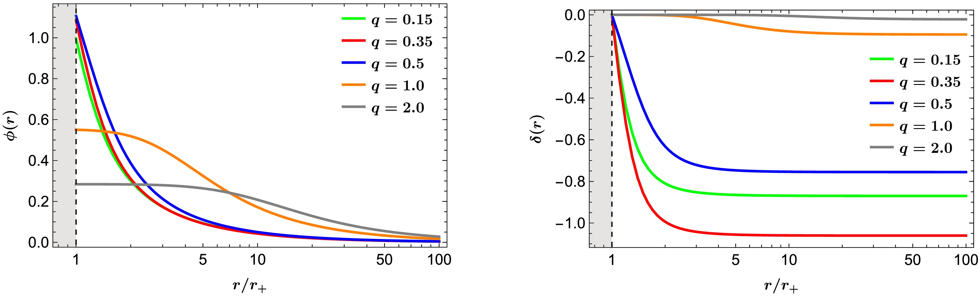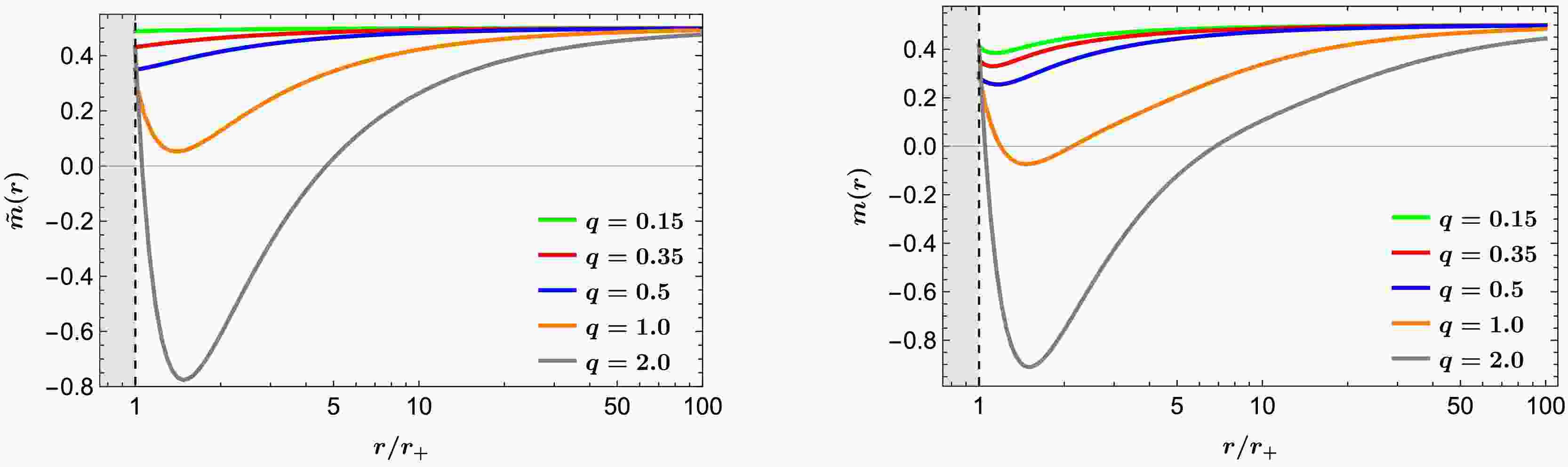 $ \phi(r\in[r_+,100],q) $ with$ q=0.15,0.35,0.5,1,2 $ . These all are decreasing functions of r with different initial values at$ r=r_+ $ . (Right)$ \delta(r\in[r_+,100],q) $ with different$ q=0.15,0.35,0.5,1,2, $ are negative decreasing functions of r.For comparison, Fig. 4 display the two mass functions