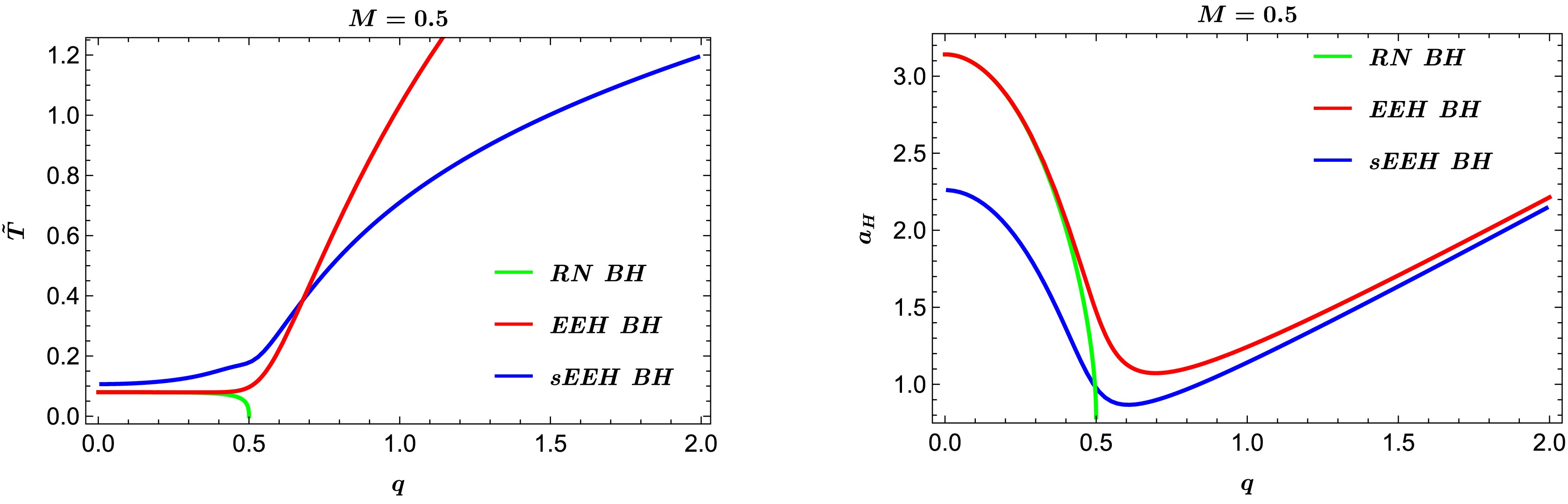 $ \tilde{T}_{\rm{RN}}(M,q) $ for the RN black hole (see Fig. 5 (Left)). Also, the area-law entropy for EEH black hole is defined by