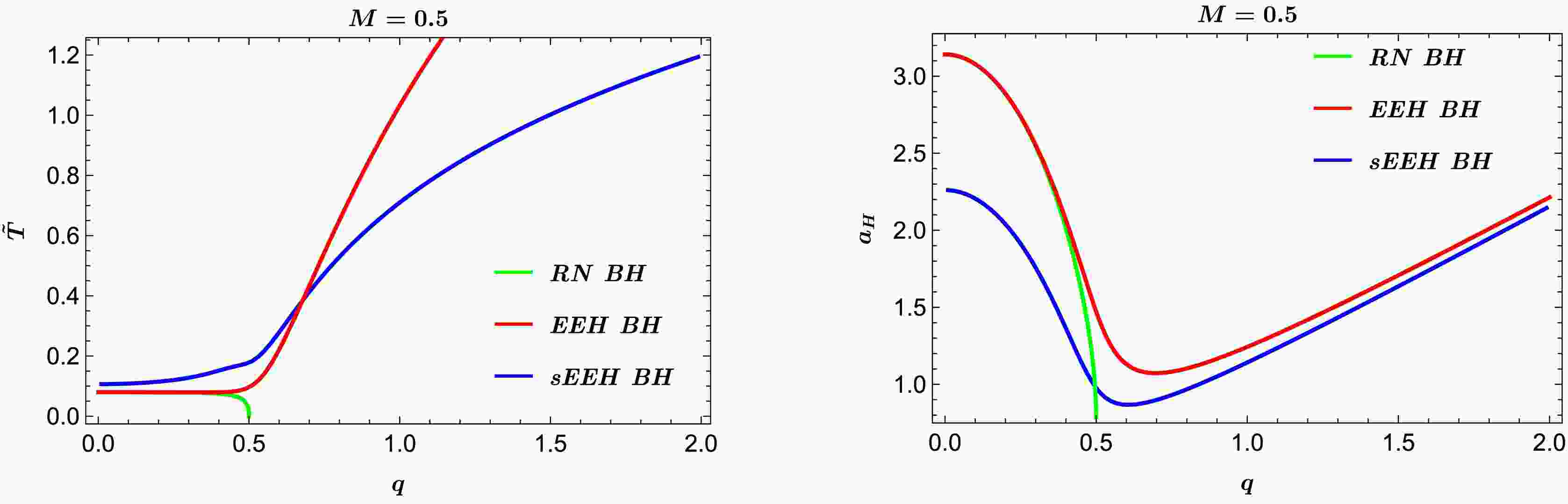 $ \tilde{T}(M=0.5,q) $ and$ \tilde{T}_{\rm{RN}}(M=0.5,q) $ correspond to the EEH and RN black holes, respectively, with the former increasing and latter decreasing as functions of q. The EEH black hole reaches its minimum temperature$ \tilde{T}=0.08 $ at$ q=0.35 $ , whereas the RN black hole's minimum temperature$ \tilde{T}_{\rm{RN}} $ =0 at extremal point ($ q=0.5 $ ). The temperature for sEEH black holes is defined by$ T(M,q)= \frac{1}{4\pi}N'(r_+)e^{-\delta(r_+)}, $