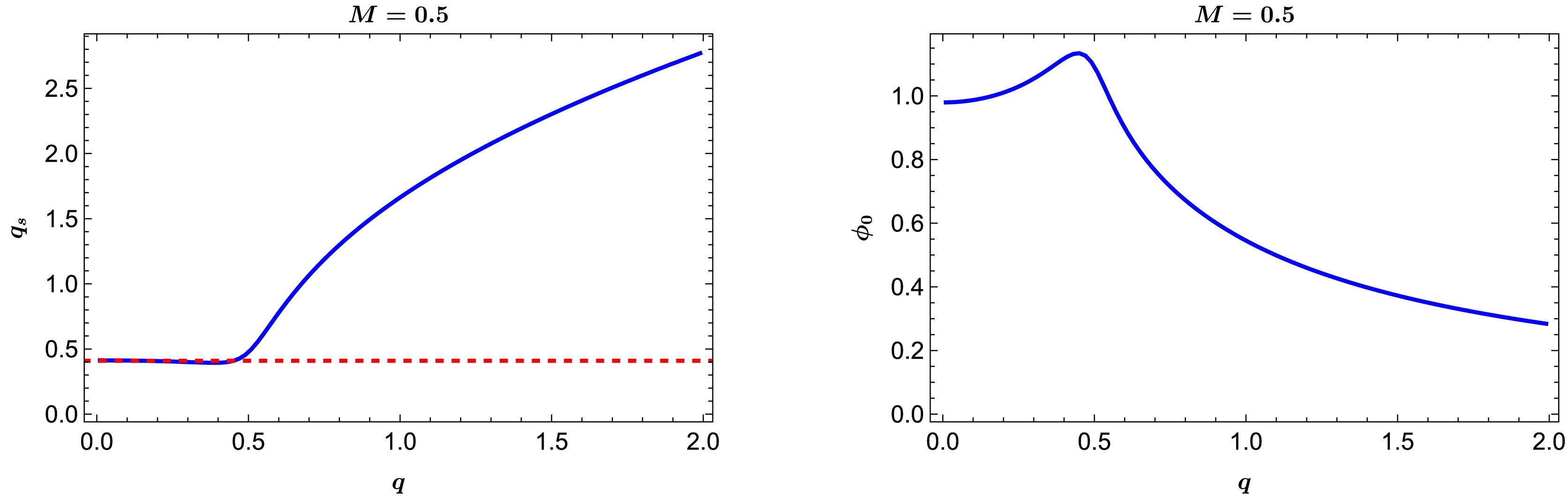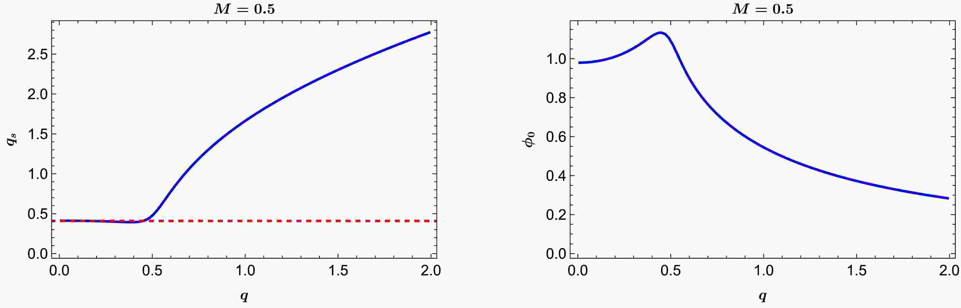 $ q_s(M=0.5,q) $ and scalar constant$ \phi_0(M=0.5,q) $ as functions of q. We found that$ q_s(M=0.5,q) $ varies only slightly with q for$ q<0.5 $ , while it increases more rapidly when$ q>0.5 $ . This behavior corresponding to the differing scalar slops observed for various q in Fig. 3 (Left). Notably, this suggests that the scalar field exhibits the characteristics of a primary charge for$ q \leq 0.5 $ , whereas the growth of$ q_s(q) $ for$ q \gt 0.5 $ indicates a secondary scalar charge. This result represents a novel feature of sEEH black holes.
