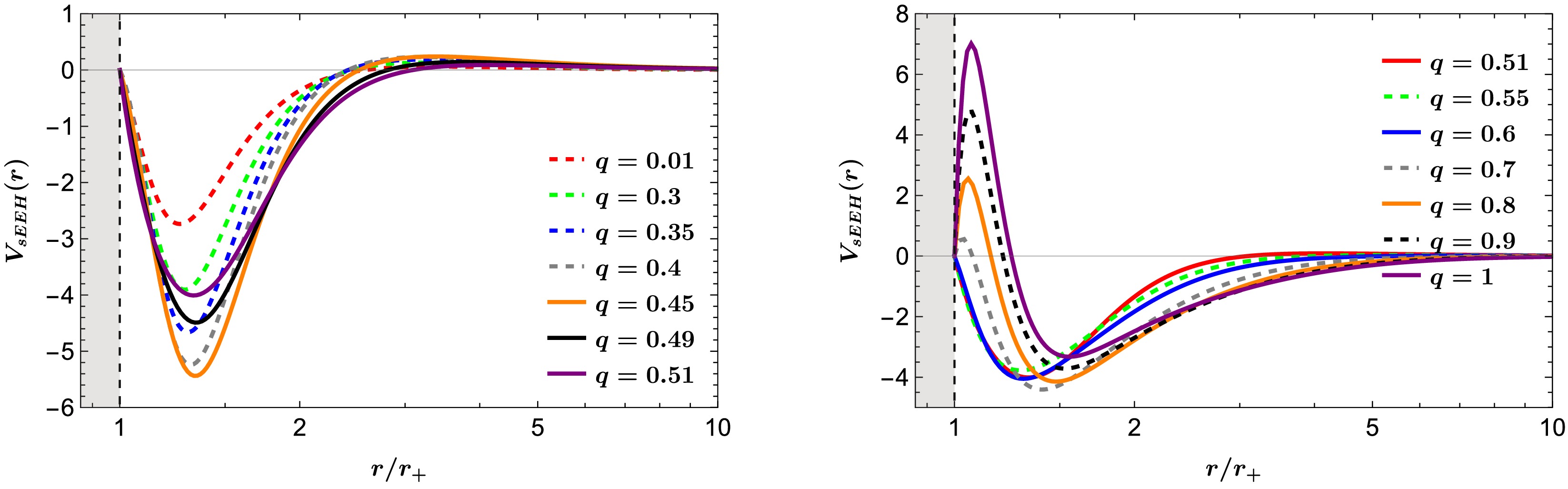$ q=0.7 $ with$ M=0.5 $ (see Fig. 5 (Right)).We now introduce perturbations around the EEH black hole