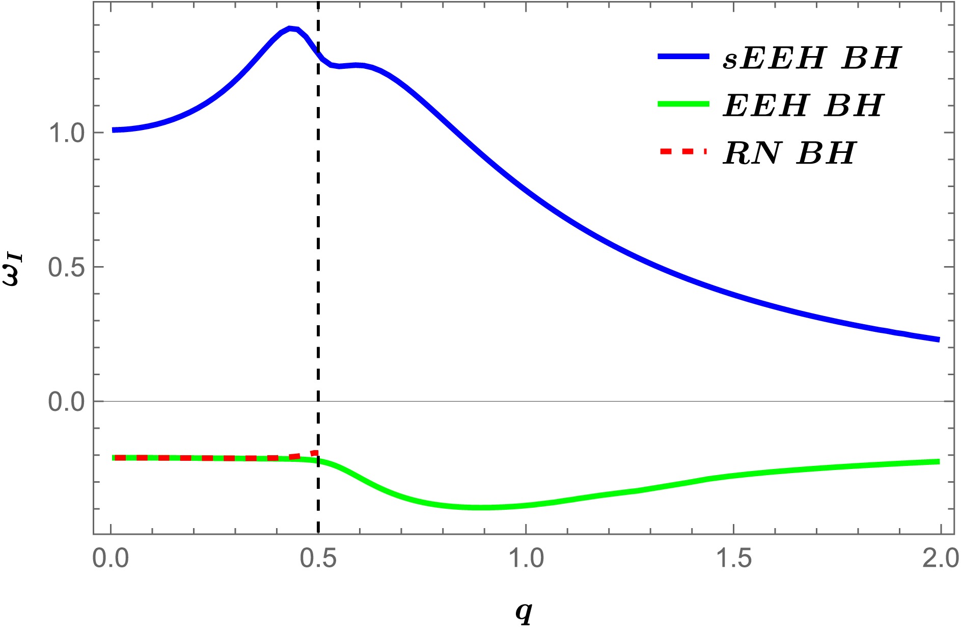 $ \omega=\omega_R+i\omega_I $ subject to the standard boundary conditions: purely ingoing waves at the outer horizon and purely outgoing waves at spatial infinity. We determine ω using the pseudo-spectral method [31]. Since the real part$ \omega_R $ vanishes for all cases considered, only the imaginary part$ \omega_I $ is plotted in Fig. 9. From the numerical results, different with the case of EEH black holes and RN black holes, for the single branch of sEEH black holes with$ q>0 $ , all imaginary parts satisfy$ \omega_I(q) \gt 0 $ , which signals instability. Thus, the instability is present for any nonzero magnetic charge$ q>0 $ . Moreover,$ \omega_I(q) $ increases monotonically with q up to a maximum near$ q \approx 0.45 $ , exhibits a transition around$ q \approx 0.5 $ , and then decreases monotonically for larger q. This trend closely follows the variation of the potential well depth in Fig. 8 and is also qualitatively similar to the behavior of the scalar constant$ \phi_0(M=0.5,q) $ at the outer horizon, as shown in Fig. 6 (right). On the other hand, we find from Fig. 9 that RN ($ 0<q\le 1/2 $ ) and EEH ($ 0<q\le2 $ ) black holes are stable against radial perturbations because of their$ \omega_I(q)<0 $ , as predicted by (Right) Fig. 2. -