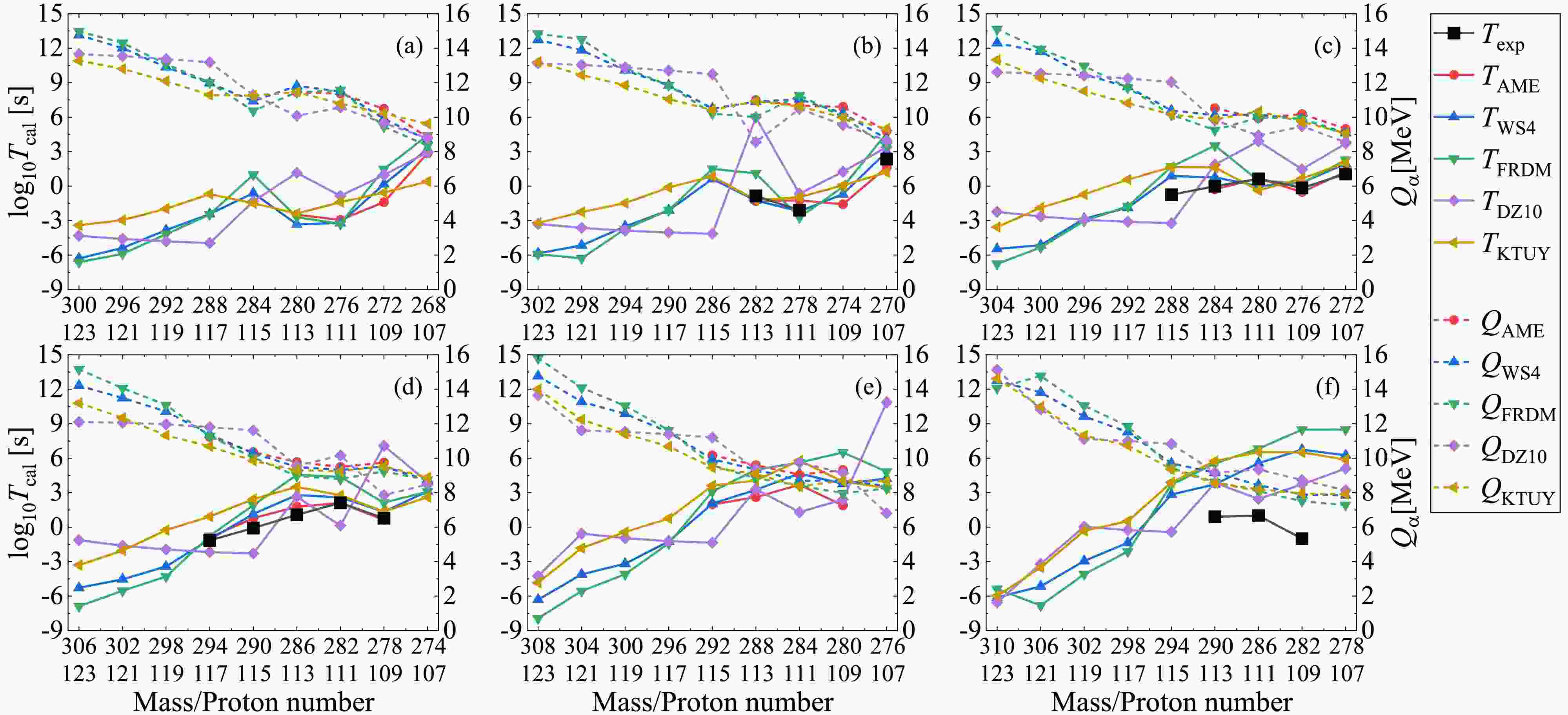 $ Q_{\alpha} $ and the solid lines represent the corresponding decay half-lives$ T_{1/2} $ . The black lines represent the available experimental α-decay half-lives given in AME2020 with known α-decay branch ratios, while the colored lines correspond to the theoretical calculations where the decay energies and preformation factors are both deduced from the nuclear masses. Besides, all panels are plotted from large mass and proton numbers to small ones, demonstrating the possible α-decay chains. Generally, the theoretical α-decay energies in all figures decrease with the decreasing mass and proton numbers, while the tendency for the theoretical decay half-lives is inverse. This is because the larger decay energy will enhance the probability of α-cluster penetrating the potential barrier, leading to smaller decay half-life. Besides, from Figs. 3-6 we can also see that among all models, the WS4 and FRDM masses provide the most consistent half-life predictions with the AME2020 data, while the DZ10 exhibits systematic fluctuations in the superheavy region. The higher accuracy of the former two mass models originates from their refined macroscopic–microscopic frameworks, which include updated shell and deformation corrections optimized for heavy nuclei. In contrast, while successful in medium-mass regions, the DZ10 model tends to estimate the nuclear masses in the superheavy domain with large uncertainty, resulting in larger deviations in decay energies and half-life predictions. The detailed numerical values for the experimental α-decay half-lives and those calculated with the DDCM using AME2020, WS4, FRDM, DZ10, and KTUY nuclear masses are listed in Table 2 for the known nuclei in Figs. 3-6. It is shown that the theoretical calculations generally agree with the experimental data, especially the AME2020 results with a smallest RMSE of 0.8. Besides, the results with WS4 masses are more consistent with the experimental data than those with FRDM, DZ10 and KTUY masses.