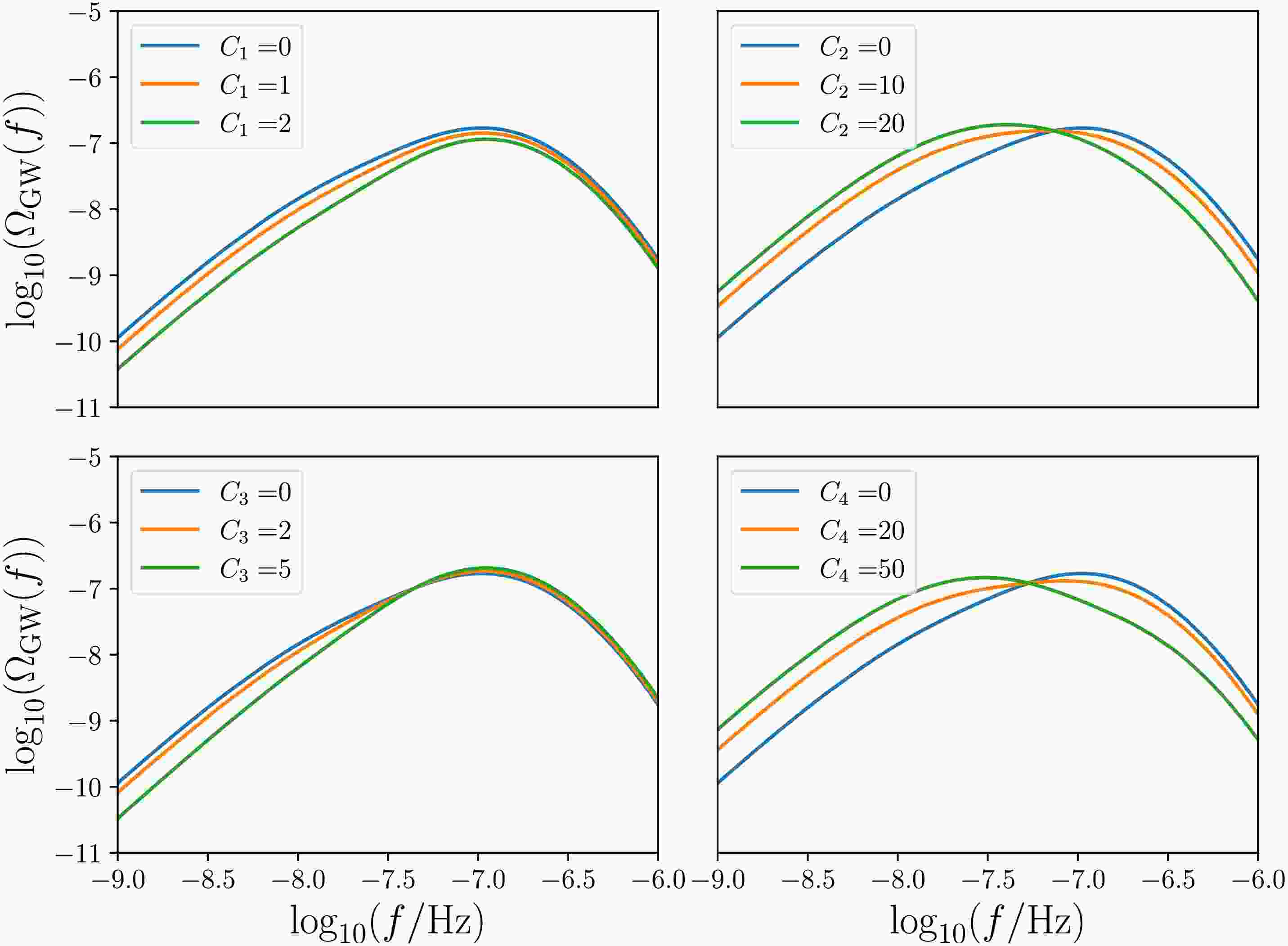 $ C_2\ne 0 $ and$ C_1\ne 0 $ , respectively. In the rest of this section, we will discuss the impact of these two models on PTA and LISA observations separately, and consider model-independent scenarios where both$ C_1 $ and$ C_2 $ are non-zero. -