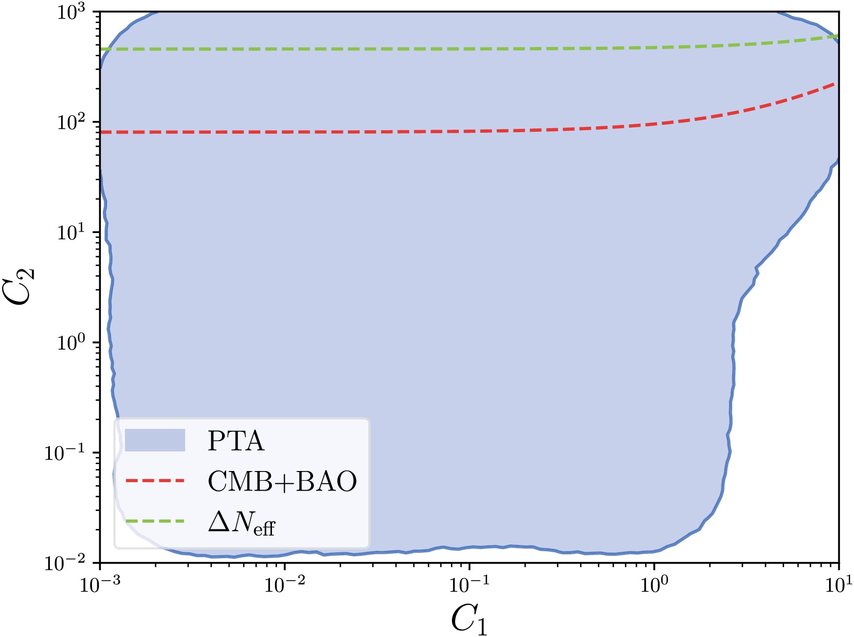 $ A_\zeta $ and$ C_1 $ assuming$ \sigma=1 $ and$ C_2=0 $ . The blue shaded region represents the 95% credible intervals corresponding to the two-dimensional posterior distribution shown in Fig. 3 with the KDE method. The red and green lines denote the lower bounds of$ C_1 $ from CMB and BAO observations in Eq. (42) and$ \Delta N_{\mathrm{eff}} $ in Eq. (41).