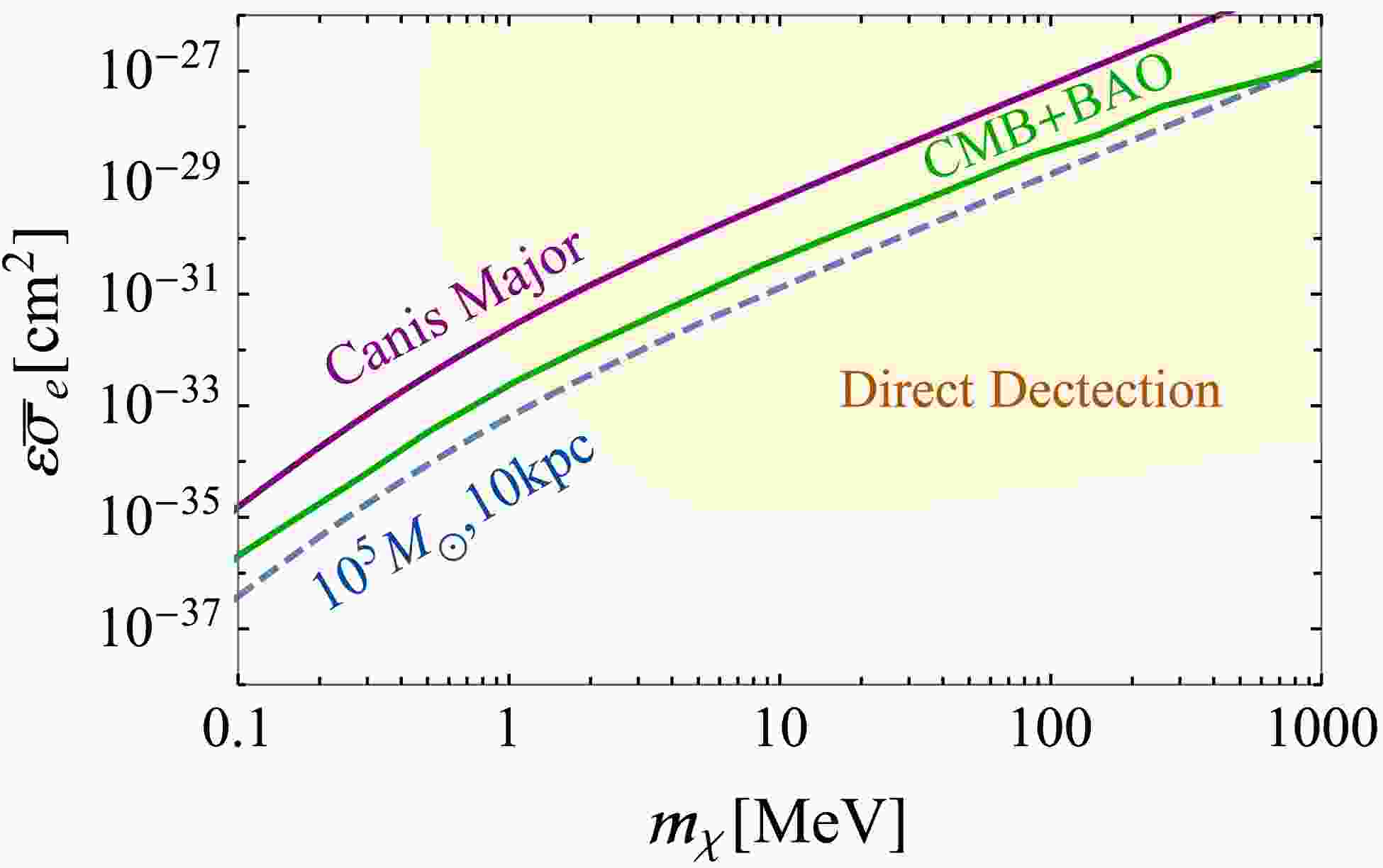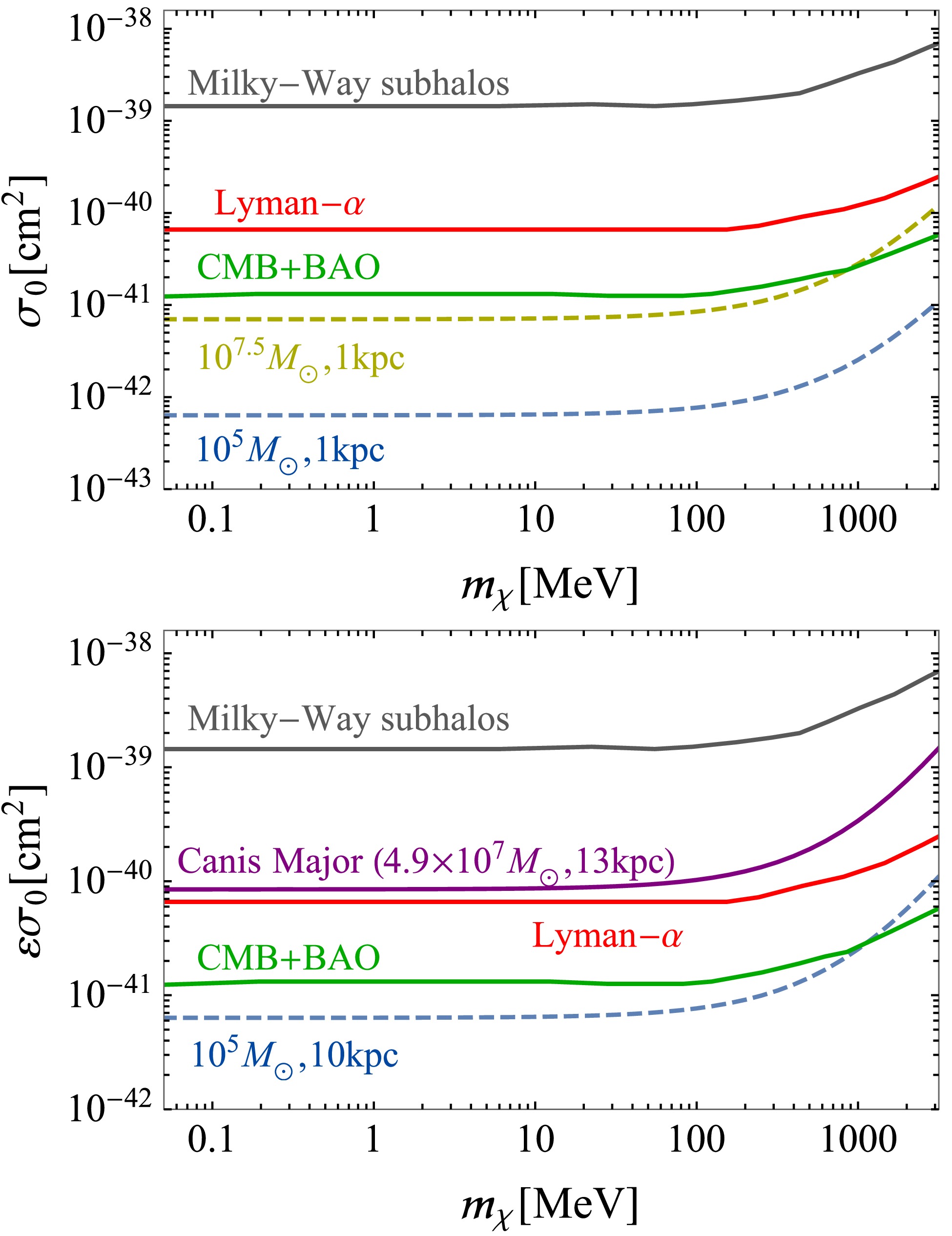 $ 10^{7.5} \;M_\odot $ subhalos, and the expected evaporation limit is shown by the yellow dashed line. This line aims to illustrate the maximal soft scattering evaporation ability. For a DM mass below 1 GeV, with existing CMB+BAO limits, soft collisions alone can evaporate away$ 10^{7.5} \;M_\odot $ subhalos at 1 kpc distance from the galactic center. In the lower figure, we show a real example, the Canis Major substructure, which is located at a distance of approximately 13 kpc from the Milky Way's center and has a mass of approximately$ 4.9\times10^{7} \;M_\odot $ [65]. The center of the Canis Major Dwarf Galaxy lies around$ (1, b) \sim\left(240^{\circ}, -8^{\circ}\right) $ (l and b are the Galactic longitude and latitude, respectively), and its orbit is almost coplanar with the galactic disk. Current observations and N-body simulations indicate that it is being disturbed by the Milky Way's gravity, but its core still remains relatively stable [66]. The corresponding evaporation limit is shown by the purple solid line. The constraints from the datasets of CMB+BAO (solid green), Lyman-α forest (solid red) and Milky-Way subhalos (solid gray), which are from a recent study, are also shown for comparison [56].Previous cosmological constraints on DM-baryon interactions can be briefly summarized as follows: the exchange of heat between DM and baryons would cool the baryons and lead to recombination occurring earlier, which can directly impact the CMB [41, 42]. Meanwhile, in the presence of DM-baryon interactions, baryon photon coupling can convey pressure to the DM, which damps the clustering of DM against structure formation and leads to a suppression on the matter power spectrum [35−37].