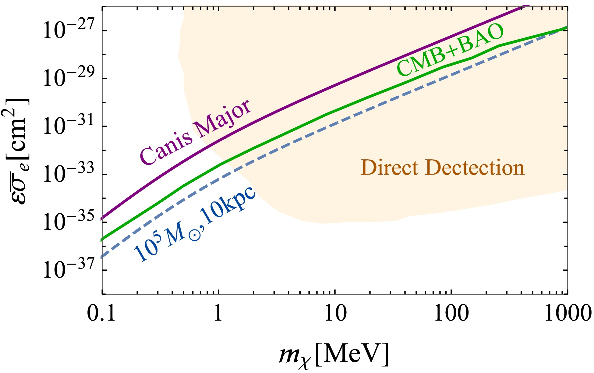 $\bar{\sigma}_e$ (dashed blue), which corresponds to subhalos with a$10^{5} \;M_\odot$ mass and a 10 kpc orbital distance to the galactic center. The solid purple line represents the evaporation limits of the Canis Major substructure. The combined direct-detection exclusion bounds obtained via DM-electron scattering experiments are shown by the orange shaped region. The bounds from datasets of CMB+BAO (solid green) are also shown for comparison. -