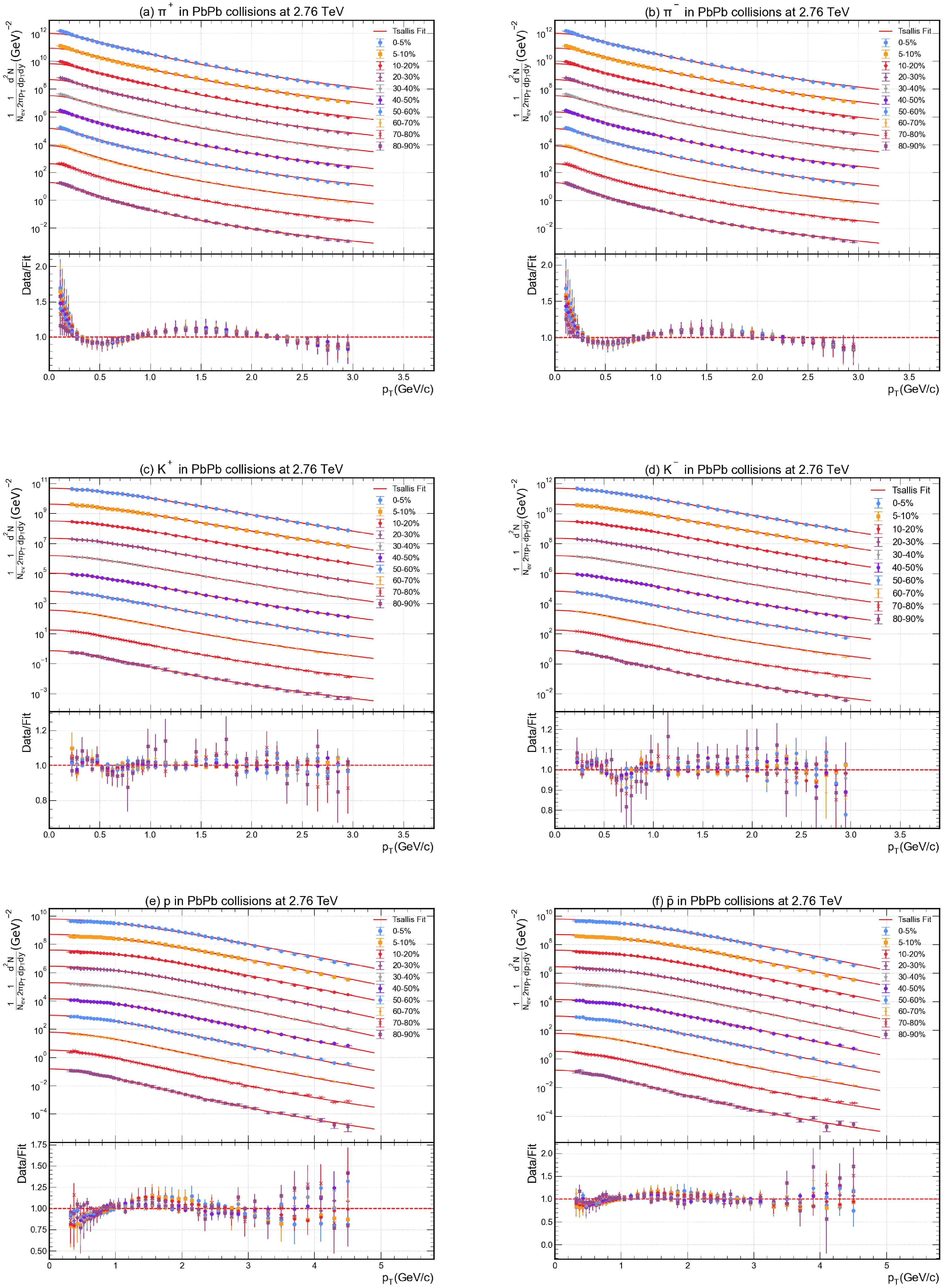 $ p_T $ distributions of$ \pi^+ $ ,$ \pi^- $ ,$ K^+ $ ,$ K^- $ , p, and$ \bar{p} $ are superimposed over the fit function across different centrality classes in Pb–Pb collisions at a collision energy of 2.76 TeV. Experimental data for various centrality values are shown with different coloured data points, while the solid lines give the fitting result, using Eq. (2). Each graph has been provided with a Data/Fit panel attached to the lower part.