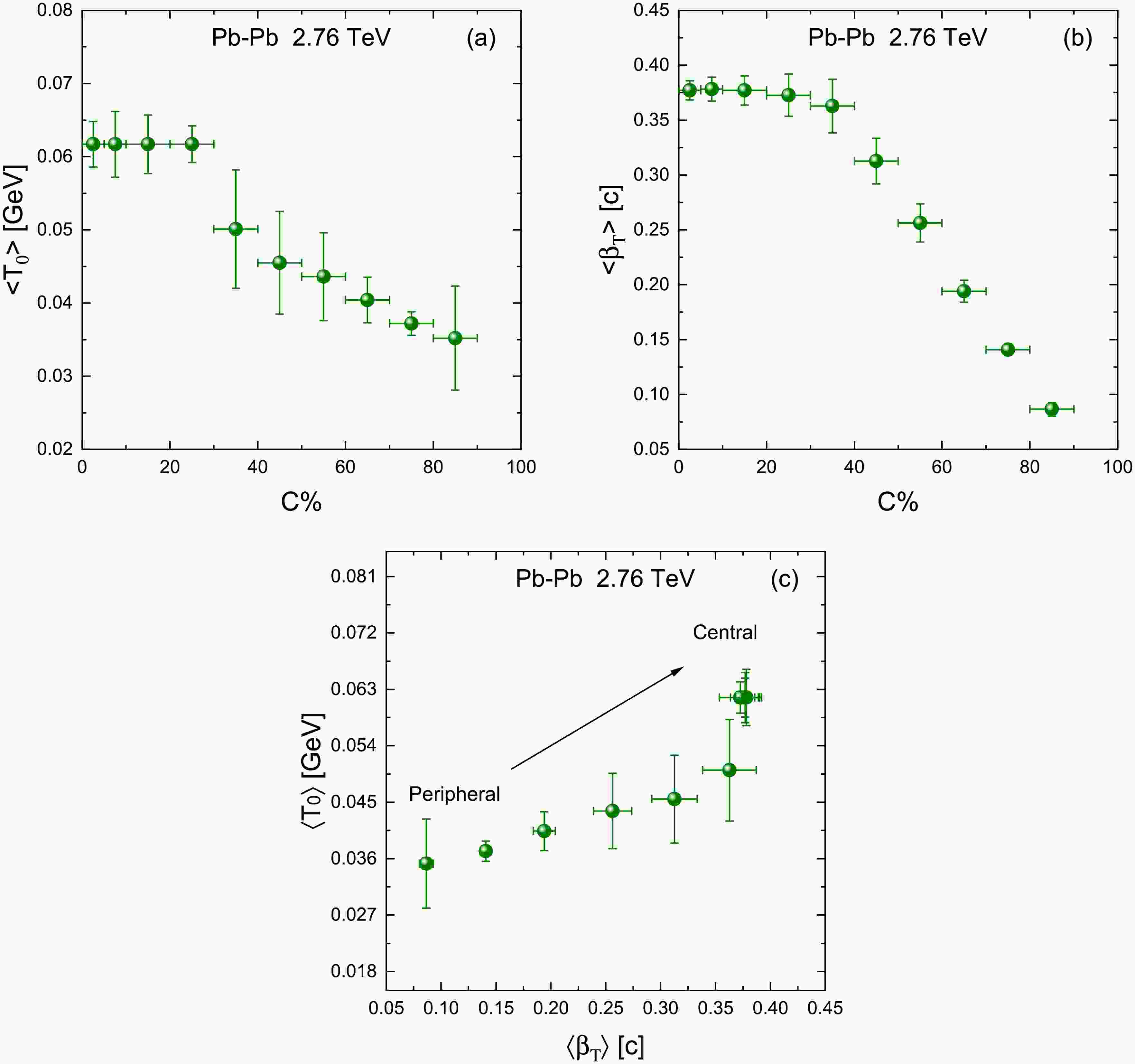 $ \langle T_0 \rangle $ and (b)$ \langle \beta_T \rangle $ as a function of centrality. (c) The correlation between$ \langle \beta_T \rangle $ and$ \langle T_0 \rangle $ .Figure 6b shows the average transverse flow velocity