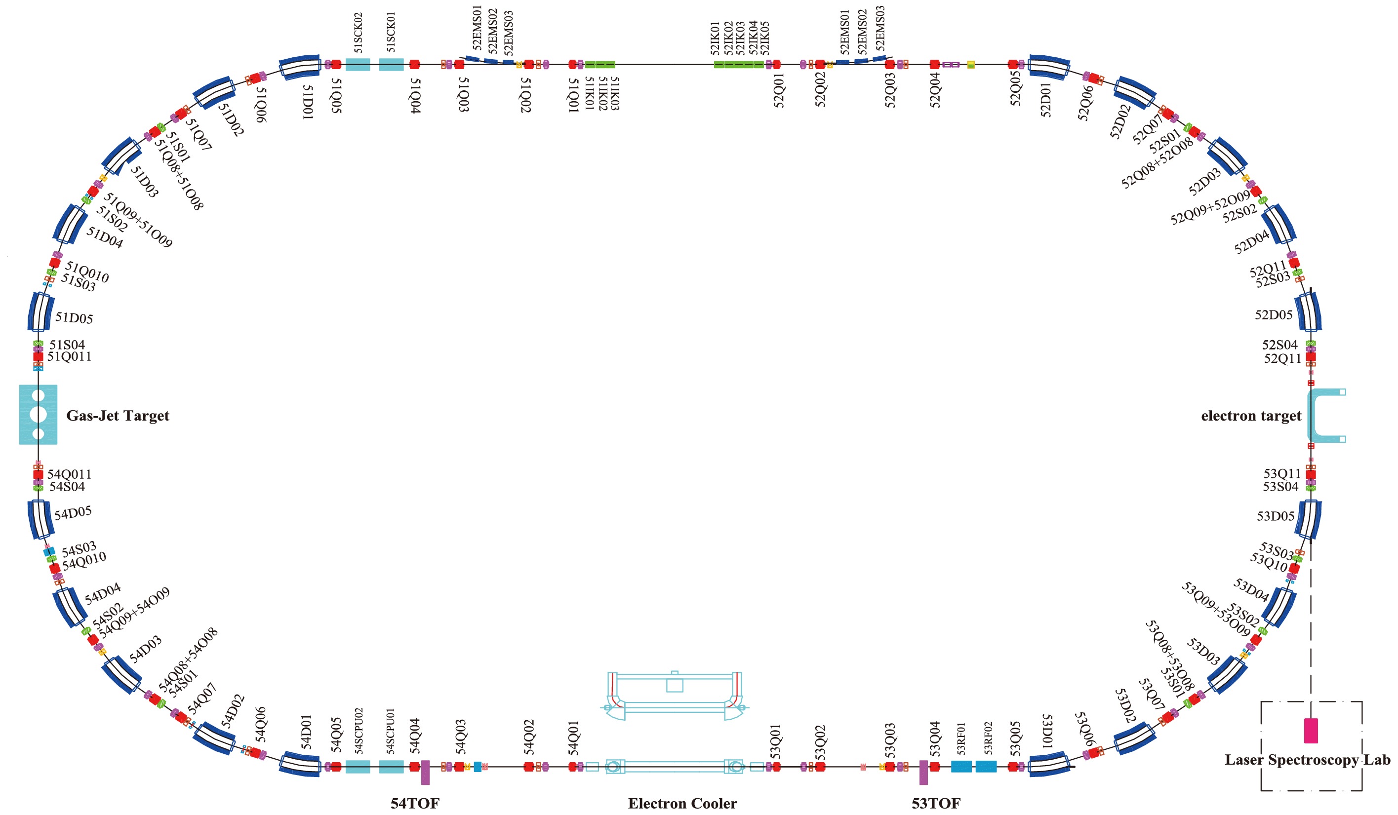 Figure 1. (color online) Layout of the SRing lattice. The blue, red, and green squares represent the dipoles (D), quadruples (Q), octupole coils (O) and sextupoles (S) , respectively. The cyan squares represent the electron cooler, electron target, and Gas-Jet target. The purple squares represent the TOF detectors.