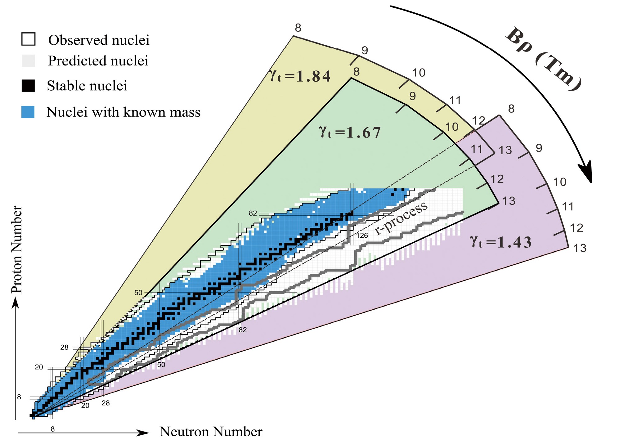 Figure 2. (color online) Nuclides that could be measured in the SRing. Different sectors indicate the regions of nuclei that can be accessed with different isochronous settings and corresponding Bρ of the SRing. Known and stable nuclides are shown by black and blue, respectively [22−25]. A predicted astrophysical rapid-neutron capture process is shown as a brown curve [26].