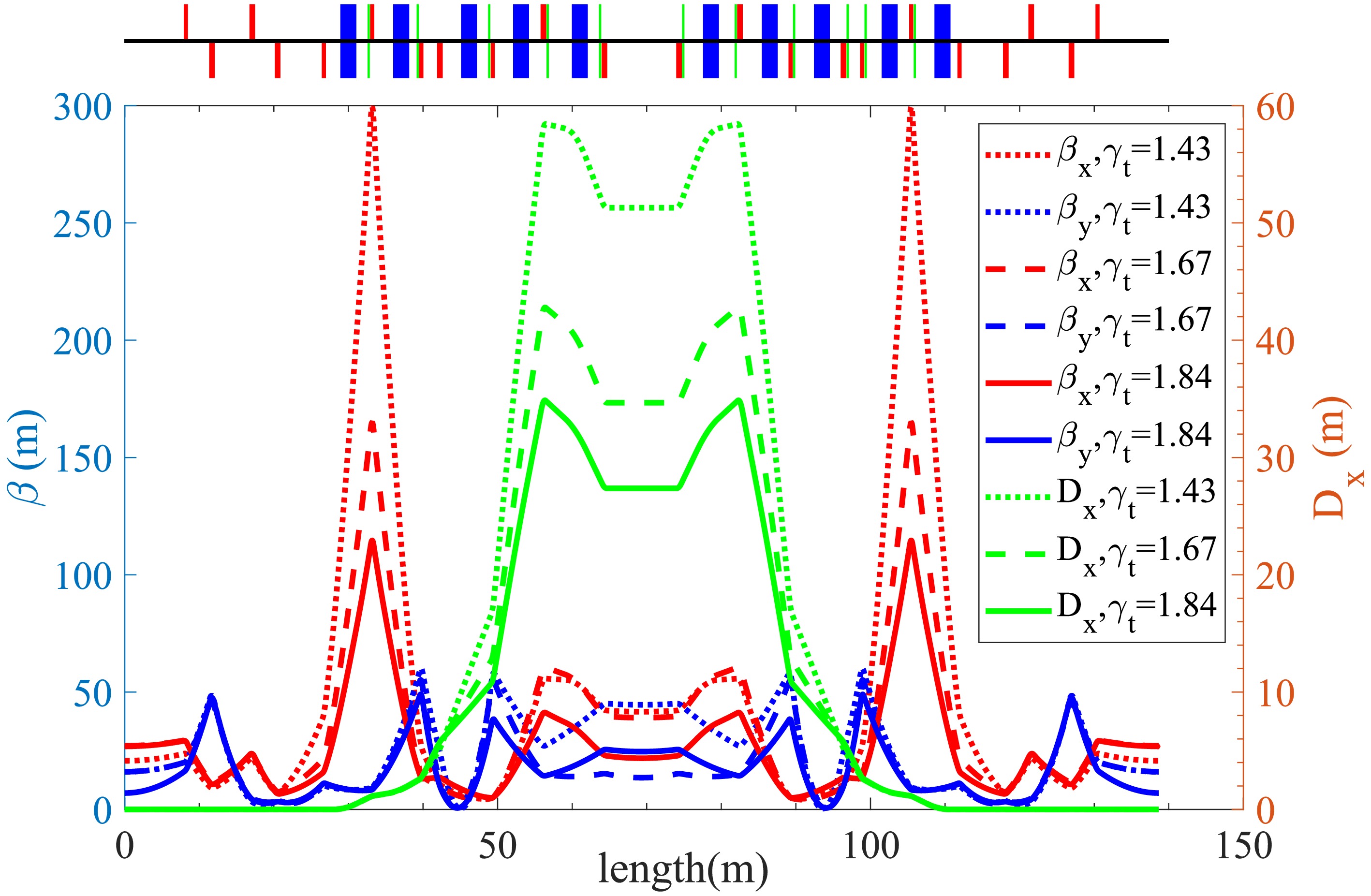 $\beta $ functions and dispersion functions along path length of half SRing for different$\gamma_t $ settings.transition energy $ \gamma_t $