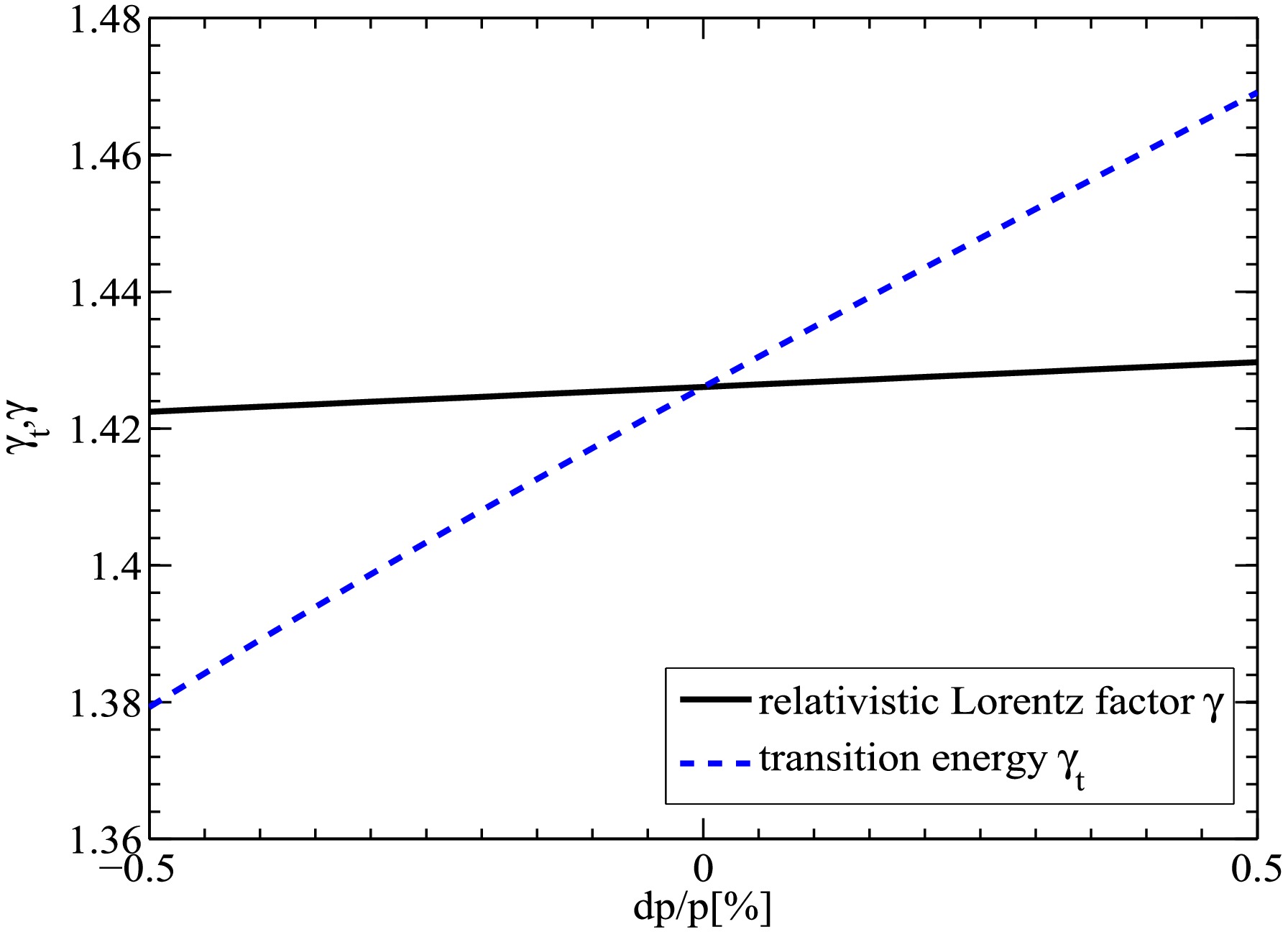$ m/q $ ) and velocities (v) [8, 9]:$ \frac{\Delta T}{T} = \frac{1}{{\gamma_{t}}^{2}}\frac{\Delta (m/q)}{m/q} + \Biggl(\frac{{\gamma}^{2}}{{\gamma_t}^{2}}-1\Biggr)\frac{\Delta v}{v}+\Biggl(\frac{{\rm d}T}{T}\Biggr)_{\rm add} ,$