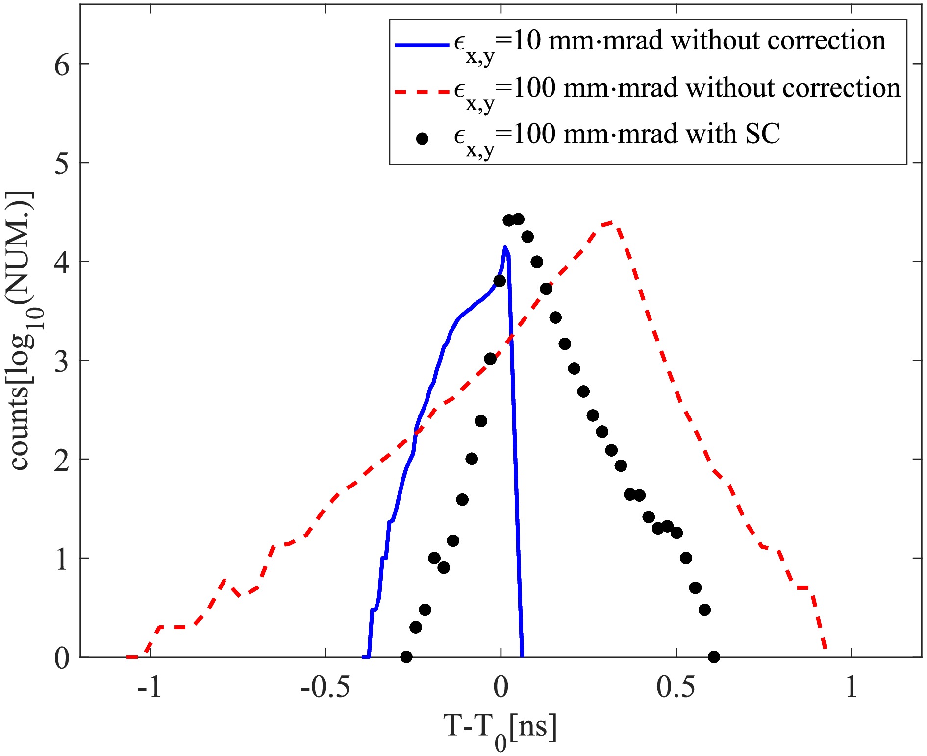 As illustrated in Fig. 6, the revolution time spread increases linearly with the beam transverse emittance. In the simulations, we used