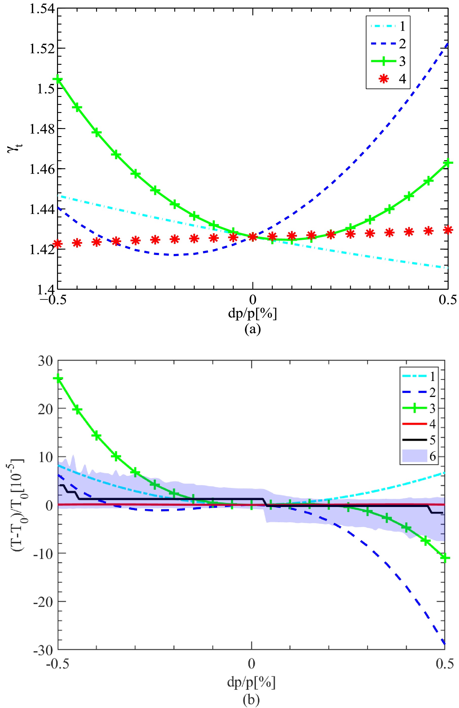 $ $ $({\rm d}T/T)_{\rm add} $ on the right side of Eq. (1) [32, 33]. These aberrations include the influence of momentum deviation, transverse emittance and nonlinear field errors, etc [34−37]. The aberrations are corrected with two tricks. In the first trick, the influence of transverse emittance is investigated corrected by using sextupoles in the dispersive section. This trick tries to minimize the width of$\gamma_t $ curve in Fig. 4 without considering of its shape. The second trick will focusing on investigation the shapes of$\gamma_t $ curve with influence of field imperfections in addition to the unisochroneity of linear lattice shown in Fig. 4, and correction of the$\gamma_t $ curve to satisfy isochronous condition. -
