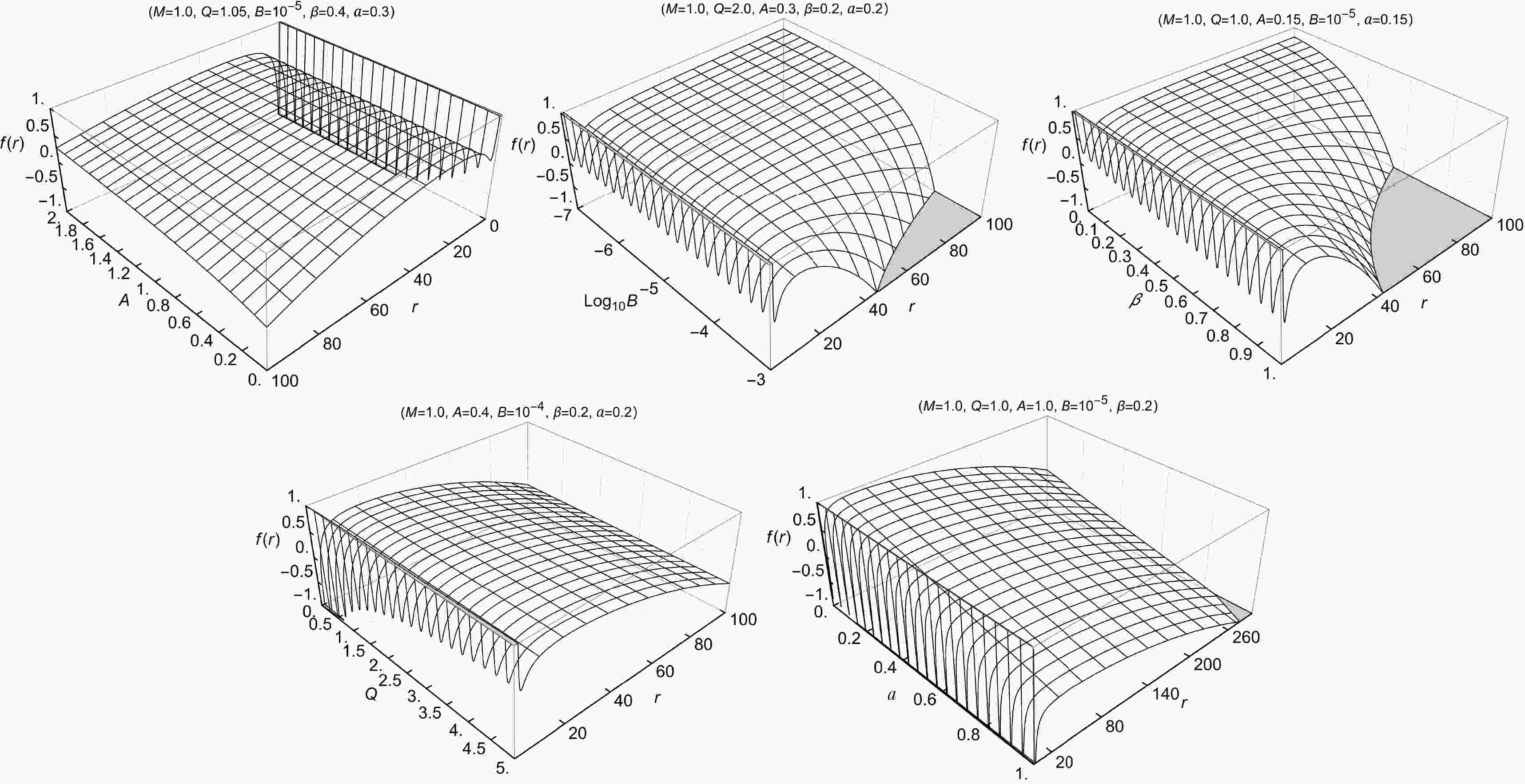 Figure 1.  Lapse function $ f(r) $with varying A, B, β, Q, and a.