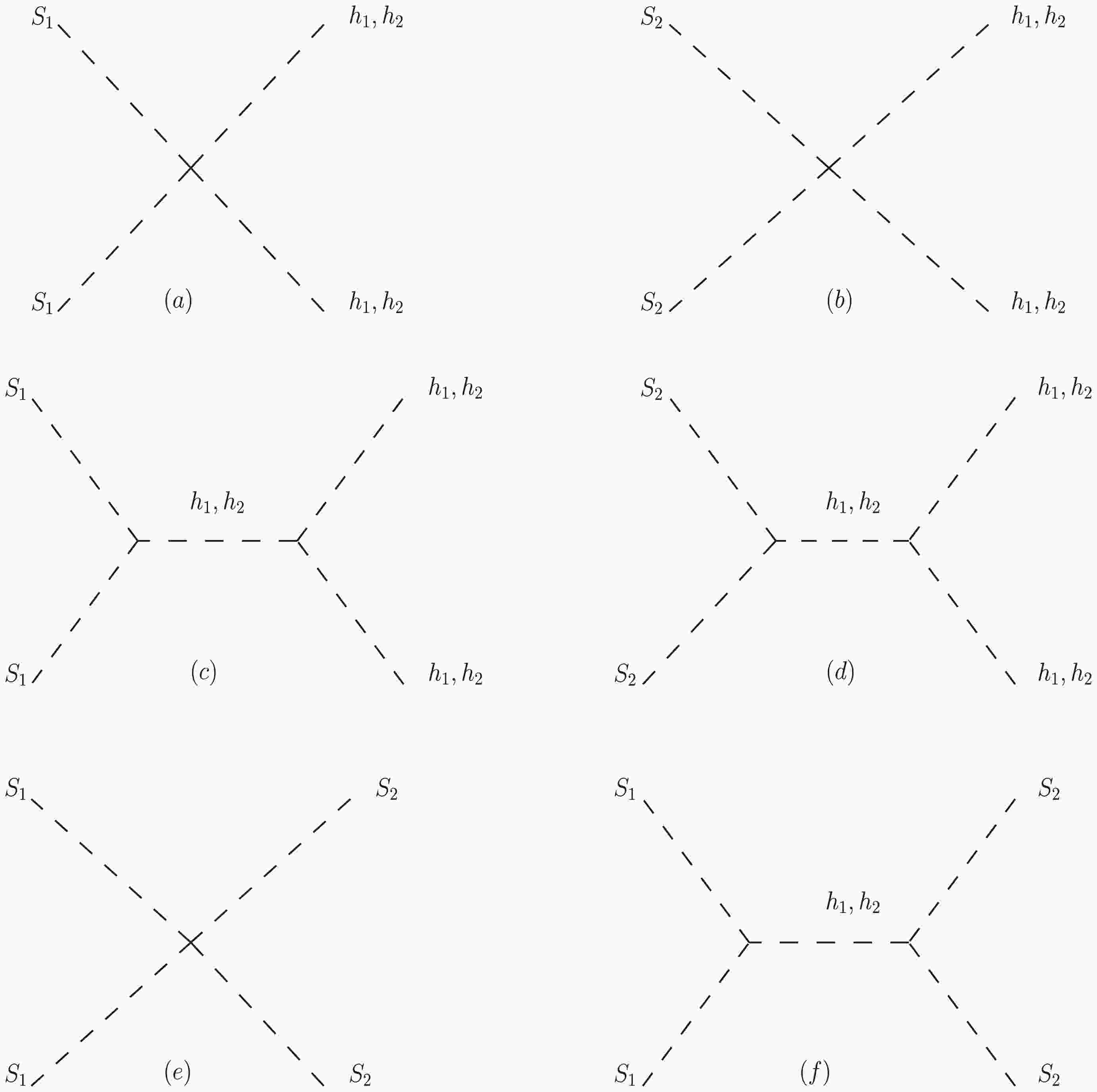 • We consider the cross section of $ S_iS_i \to h_ih_i $ and $ S_iS_i \to h_1h_2 $ $ (i = 1,2) $ in this section. We calculate the cross section using Calchep [40]. The expressions in the limit of $ \sin\theta\to 0 $ are given as