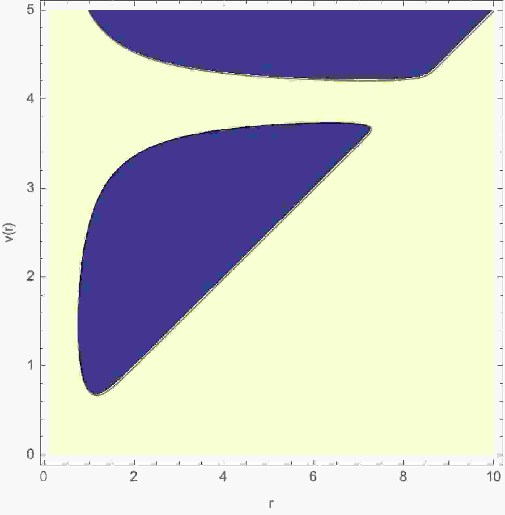 $F(v, r) = 1 - \dfrac{2M(v, r)}{r} = 0 $ , which represents the horizon structure. In Fig. 1,$F(v, r) = 0 $ is plotted as$v(r) $ , with parameters$\mu = 4 $ and$\lambda = 1 $ . The graph of$\dot{M} = 0 $ is then shown in Fig. 2.