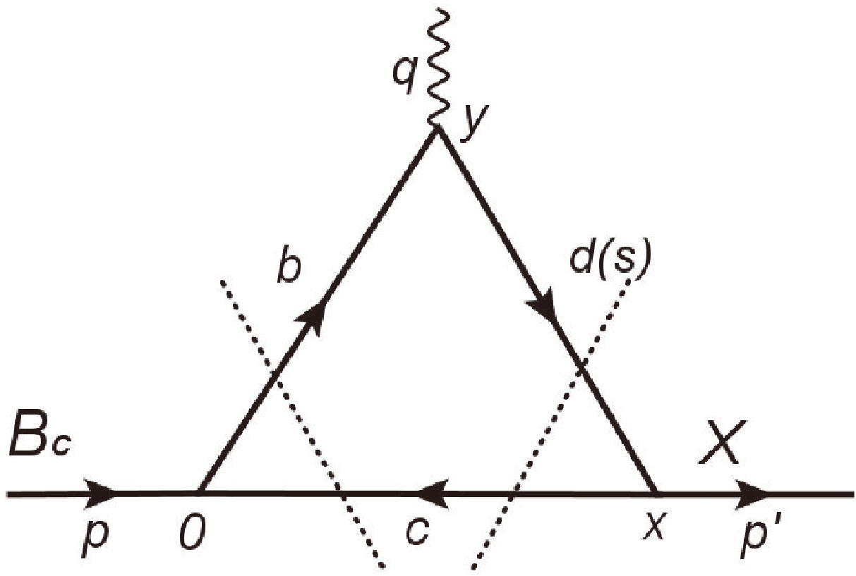 $ B_c \to D^{(*)} $ and$ B_c \to D_{s}^{(*)} $ , X denotes the meson$ D^{(*)} $ or$ D_s^{(*)} $ . p and$ p' $ are the momentums of$ B_c $ and$ D^{(*)}/D_s^{(*)} $ mesons, respectively, and$ J_{B_c} $ and$ J_X $ are interpolating currents that have the same quantum numbers as these mesons.$ J(y) $ is transition current, which is extracted from the low-energy effective Hamiltonian. These currents are written as follows:$\begin{aligned}[b] J_{B_c}(0) =\;& \bar c(0){\rm i}\,{\gamma _5}b(0)\\ J_D(x) =\;& \bar c(x){\rm i}\,{\gamma _5}d(x)\\ J_{D_s}(x) =\;& \bar c(x){\rm i}\,{\gamma _5}s(x)\\ {J^{D^*}_\mu}(x) = \;&\bar c(x){\gamma _\mu }d(x)\\ {J^{D_s^*}_\mu}(x) =\;&\bar c(x){\gamma _\mu }s(x)\\ J(y) =\;&\bar q(y)\Gamma b(y) \end{aligned} $