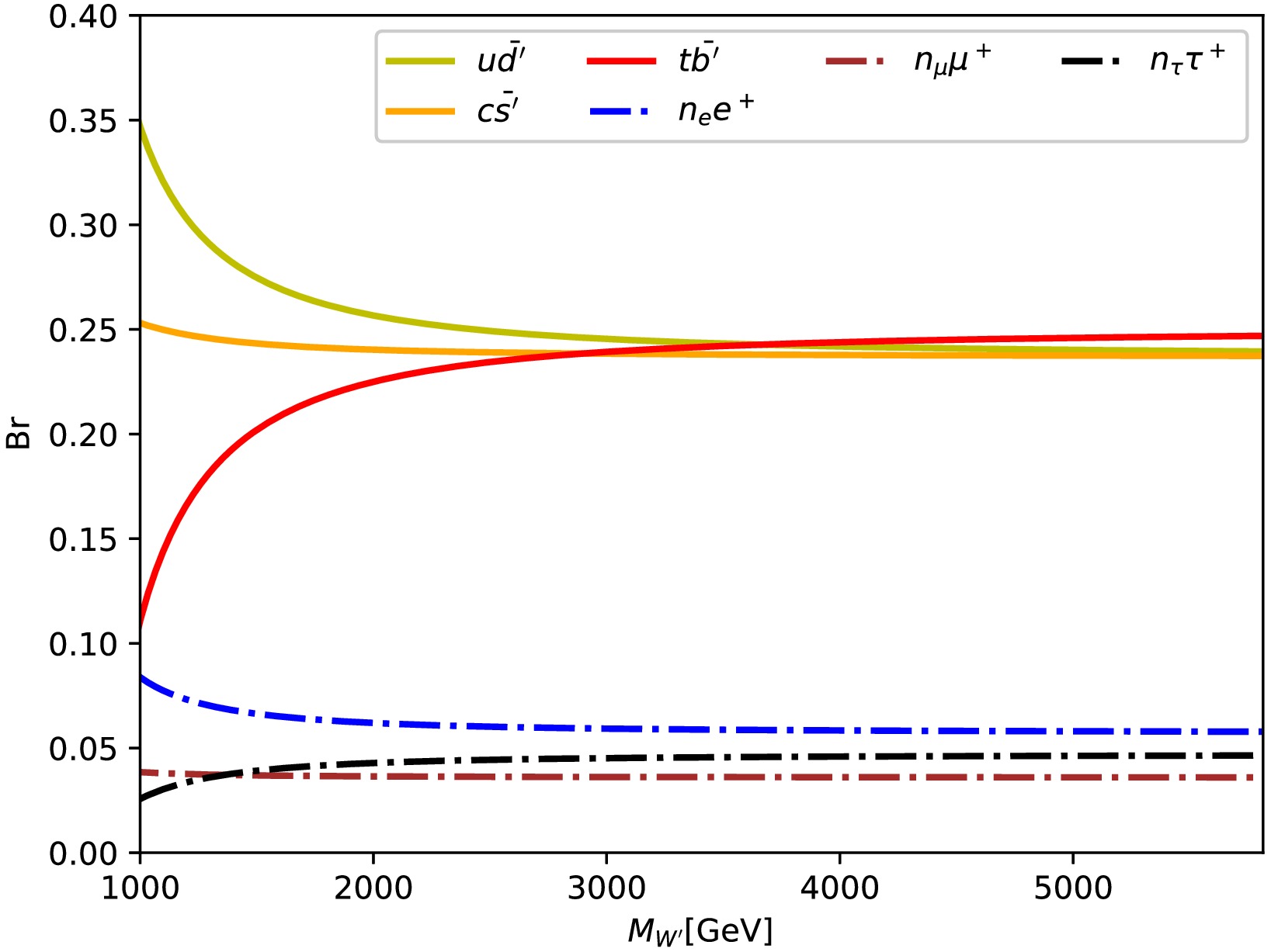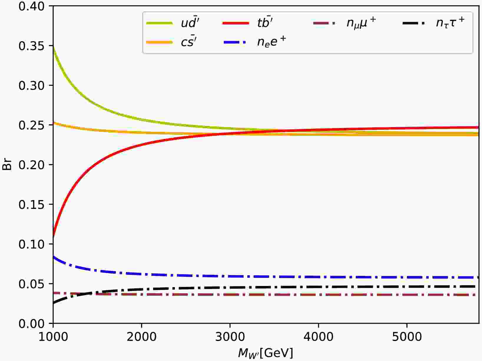 Figure 1.  (color online) Decay branching ratios of $W^\prime$.