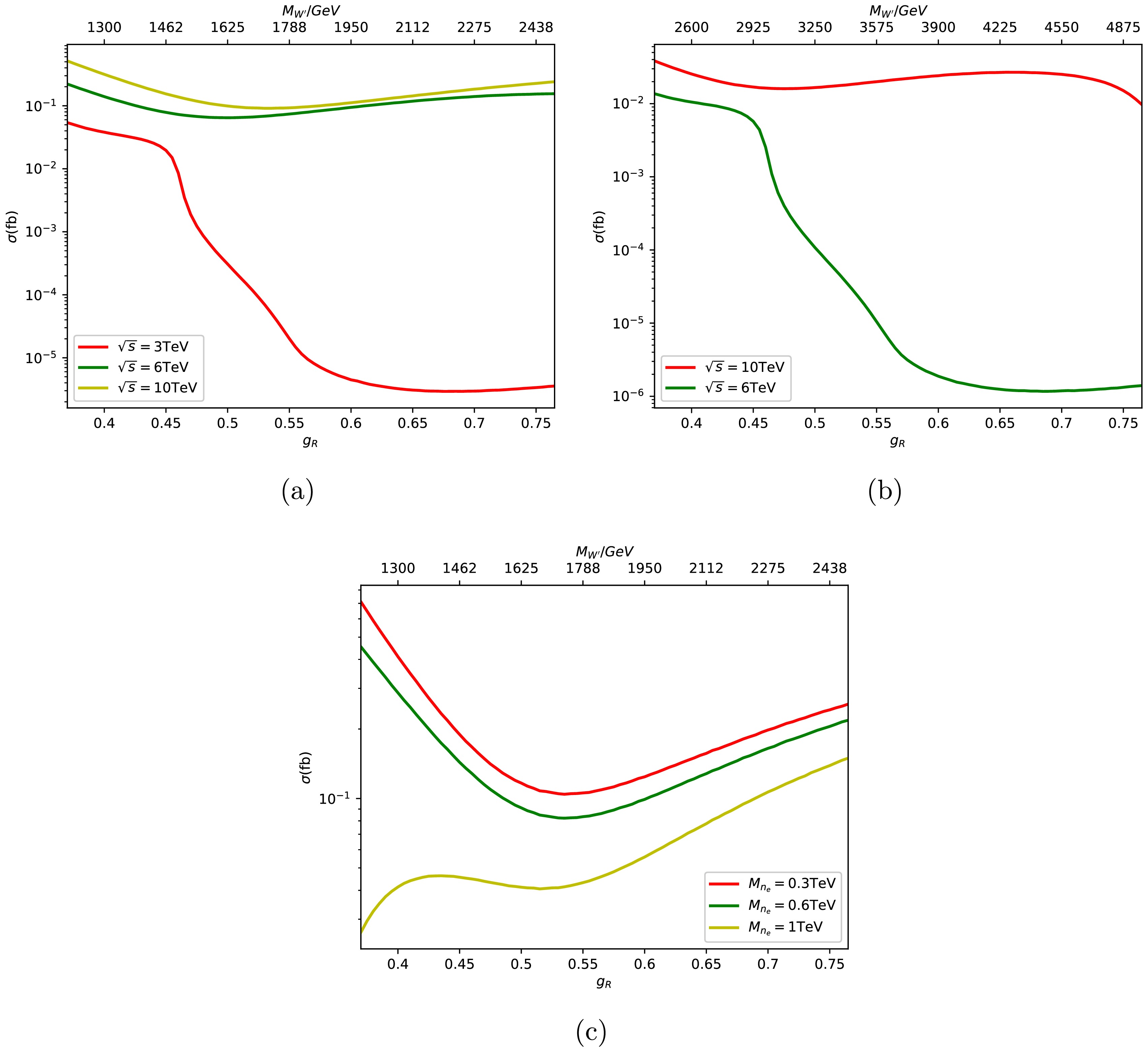 • Figure 2 shows the cross-section distribution of the $ \mu^+ \mu^- \to W^{\prime +} W^{\prime -} \to e^+ e^- n_e \bar{n}_e $ process with the right-handed coupling constant $ g_R $. The plot in Fig. 2 (a) shows the cross section for different collision energies of 3, 6, and 10 TeV (represented by red, green, and yellow solid lines, respectively). In the ALRM model, the mass of the $ W^\prime $ boson is determined by the coupling constant $ g_R $ and a vacuum expectation value obtained from Eq. (5). When the vacuum expectation value is fixed, there is a one-to-one correspondence between the right-handed coupling constant $ g_R $ and the mass of the $ W^\prime $ particle. Therefore, we added coordinate axes for both $ g_R $ and $ M_{W^\prime} $ parameters in the figure. The vacuum expectation value is fixed at 6.5 TeV in this figure. When the collision energy is 3 TeV, the cross section rapidly decreases for $ g_R = 0.45 $, with the mass of the $ W^\prime $ boson close to 1.5 TeV, given that it is approaching the threshold for $ W^\prime $ pair production. When $ g_R $ reaches its maximum of 0.765, the corresponding mass of the $ W^\prime $ boson produced is approximately 2.4 TeV, which means that the $ W^\prime $ bosons can be on shell produced with a collision energy of 6 or 10 TeV in the complete studied parameter spaces. The cross section at a collision energy of 6 TeV or 10 TeV shows a trend of first rising and then falling with increasing values of $ g_R $. These phenomena are due to the dual impact of $ g_R $ and mass of $ W^\prime $.