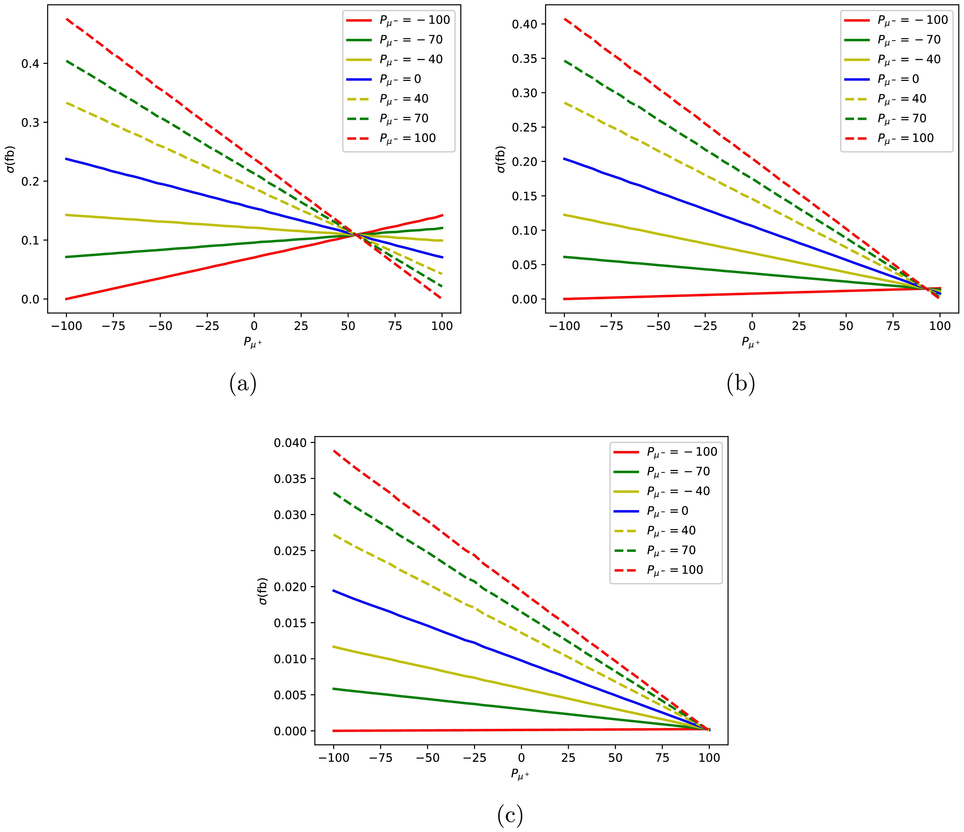Figures 3 (b) and (c) show the same distribution as that of (a) but for $ M_{W^\prime} = 3.5 $ and 5 TeV. When the mass of $ W^\prime $ increases, the cross section changes significantly for $ P_{\mu^-}< 0 $. When $ P_{\mu^-} $ equals $ -40 $, the cross section for $ M_{W^\prime} $ at 2 TeV increases gradually with the positive polarization of $ \mu^+ $, but for $ M_{W^\prime} $ at 3.5 TeV, the cross section exhibits a decreasing trend. It is important to note that when $ M_{W^\prime} $ takes values of 3.5 and 5 TeV and $ P_{\mu^-} = -100 $, the cross section continuously increases with the positive polarization of $ \mu^+ $, but the increase is relatively small.