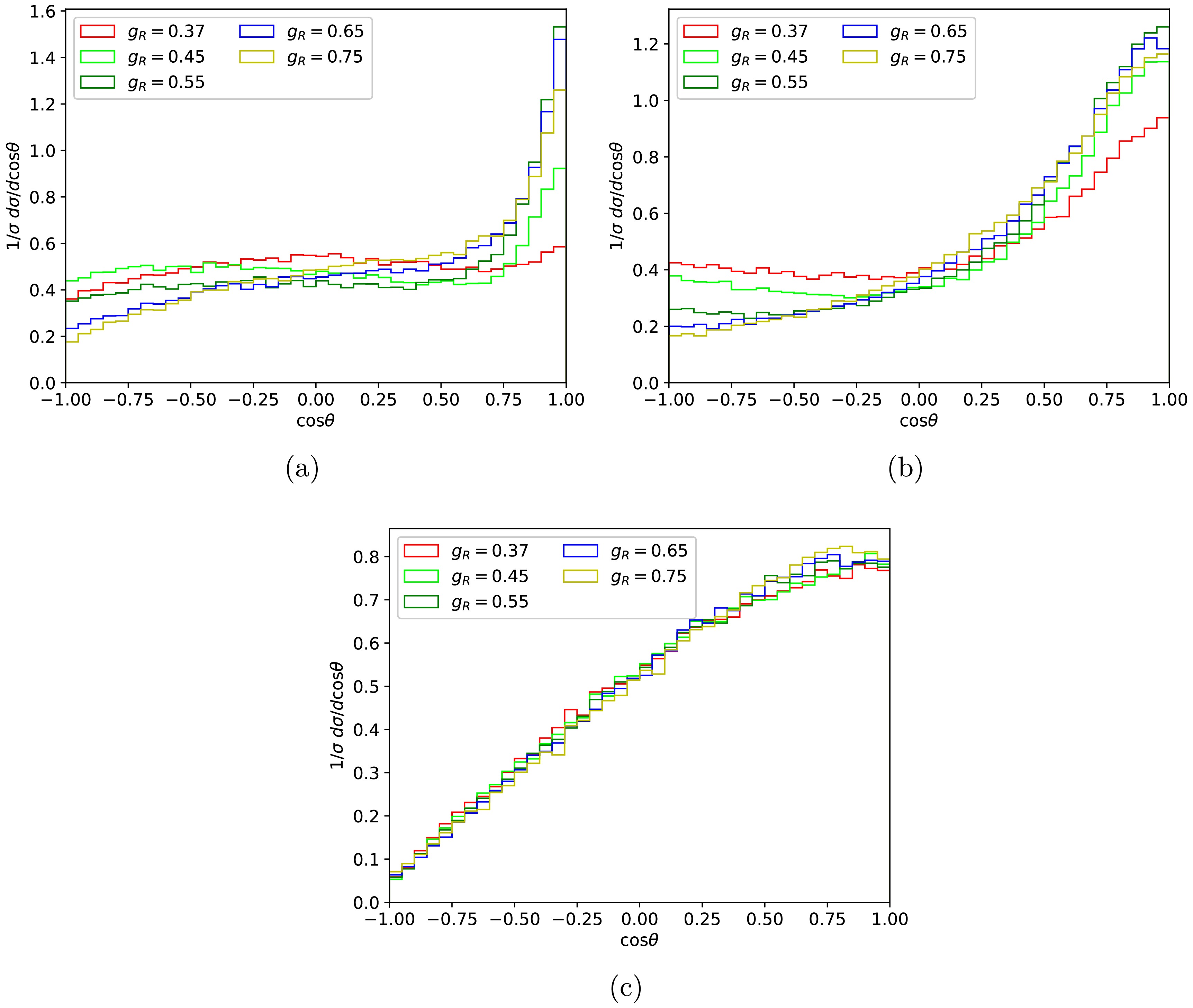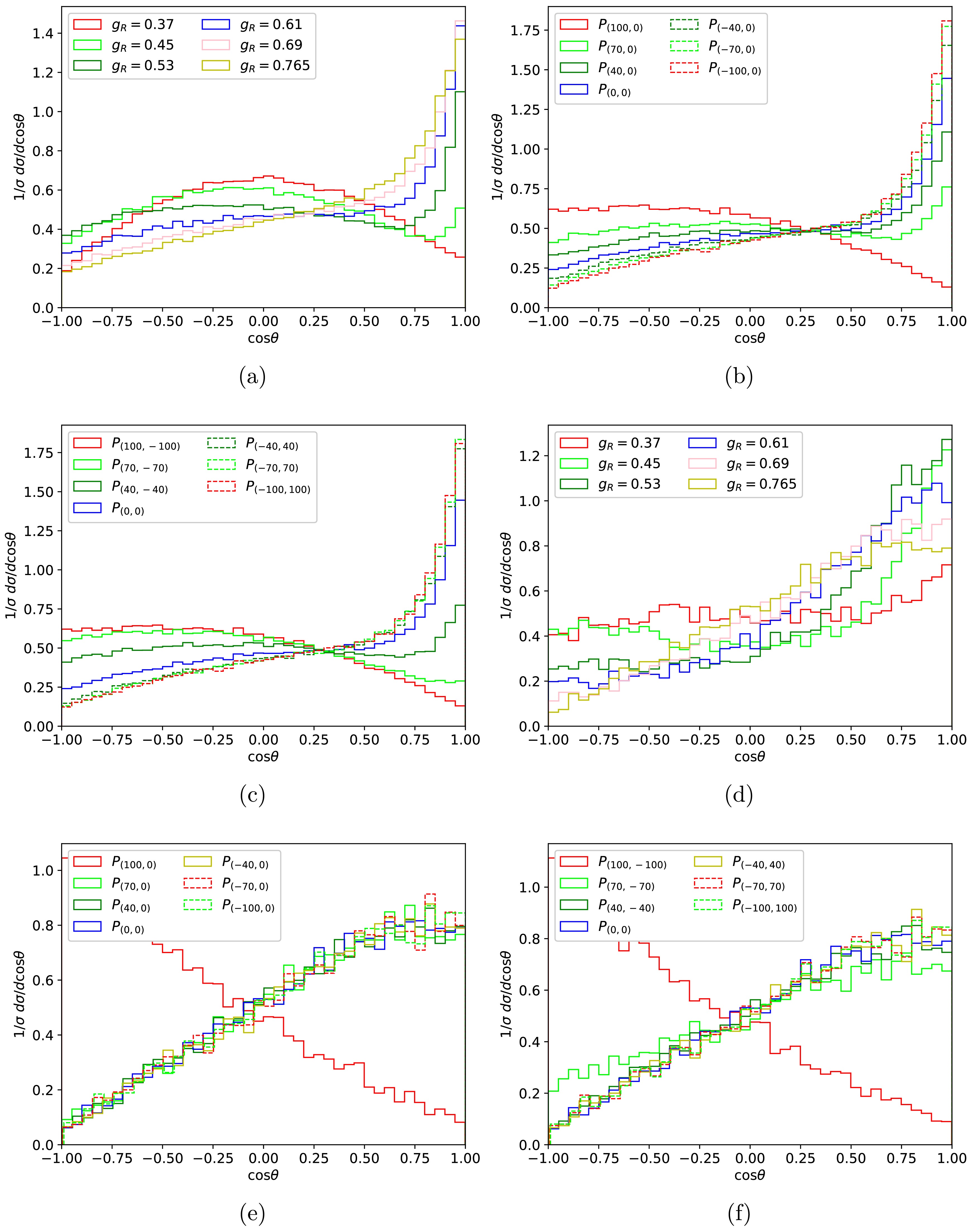 In this study, the influence of angular distribution variables has been mainly analyzed by focusing on two aspects: the spin polarization of the incident particles and the variation of coupling constants [50], which are essentially the result of the combined action of angular momentum conservation and chirality rules. First, changes in the spin polarization state of incident particles affect the polarization direction of intermediate-state particles. This leads to a preference for a specific direction in the decay process of intermediate particles into final-state particles. Therefore, different polarization states will influence the angular distribution of the final-state particles. Second, the change in angular distribution is caused by the chiral asymmetry of the coupling strength, which is related to the right-handed coupling $ g_R $ and different vacuum expectation values in the model. The V-A structure of the gauge interaction in the model leads to coupling differences between left-handed and right-handed particles, resulting in an asymmetric production process of final-state particles.