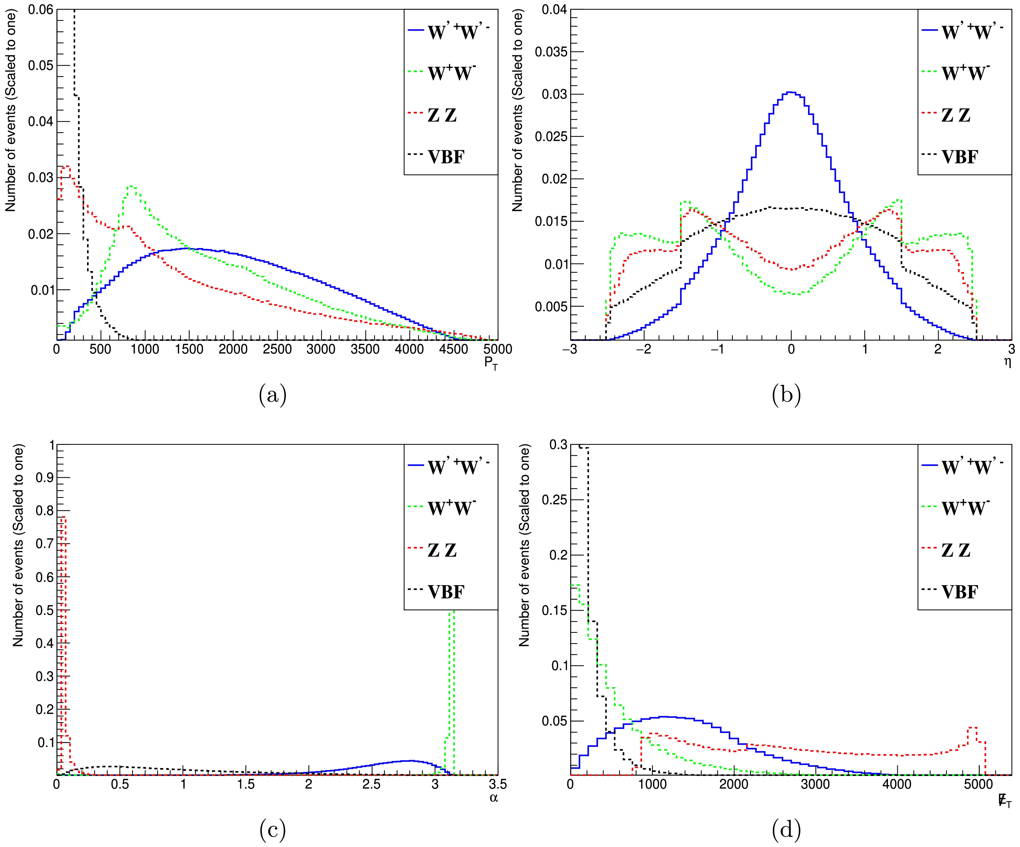 • We ran Monte Carlo simulations [48, 5153] to simulate collisions for signal and background processes, focusing on the di-lepton processes. In our simulations, we paid attention to the signal process with $ W^\prime $ pair production as an intermediate state,