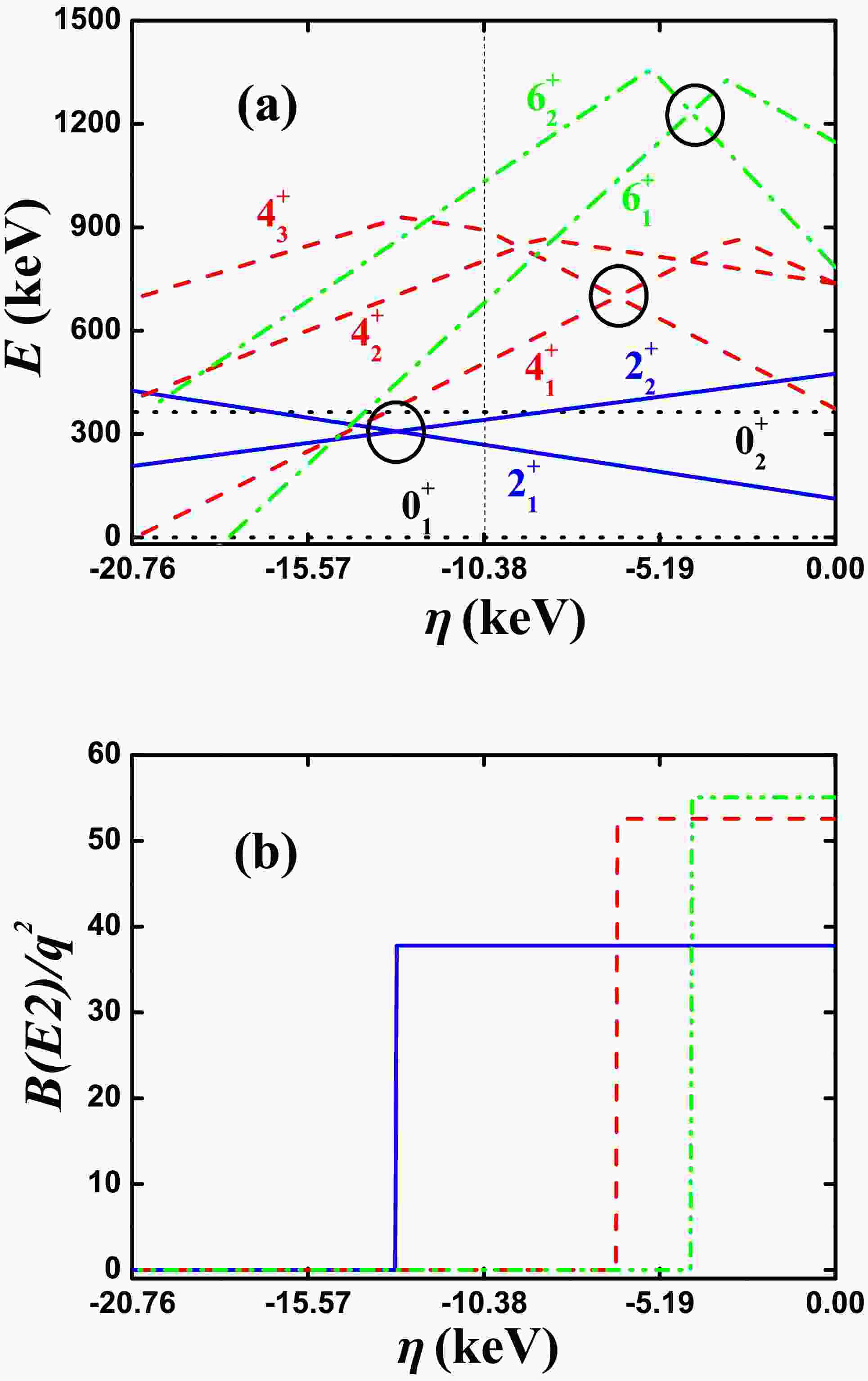 Figure 3.  (color online) (a) Evolutional behaviors of the partial low-lying levels as functions of η; (b) Evolutional behaviors of $ B(E2; 2_{1}^{+}\rightarrow 0_{1}^{+}) $ (blue real line), $ B(E2; 4_{1}^{+}\rightarrow 2_{1}^{+}) $ (red dashed line), and $ B(E2; 6_{1}^{+}\rightarrow 4_{1}^{+}) $ (green dashed dotted line) as functions of η. The parameters were deduced from Ref. [41].