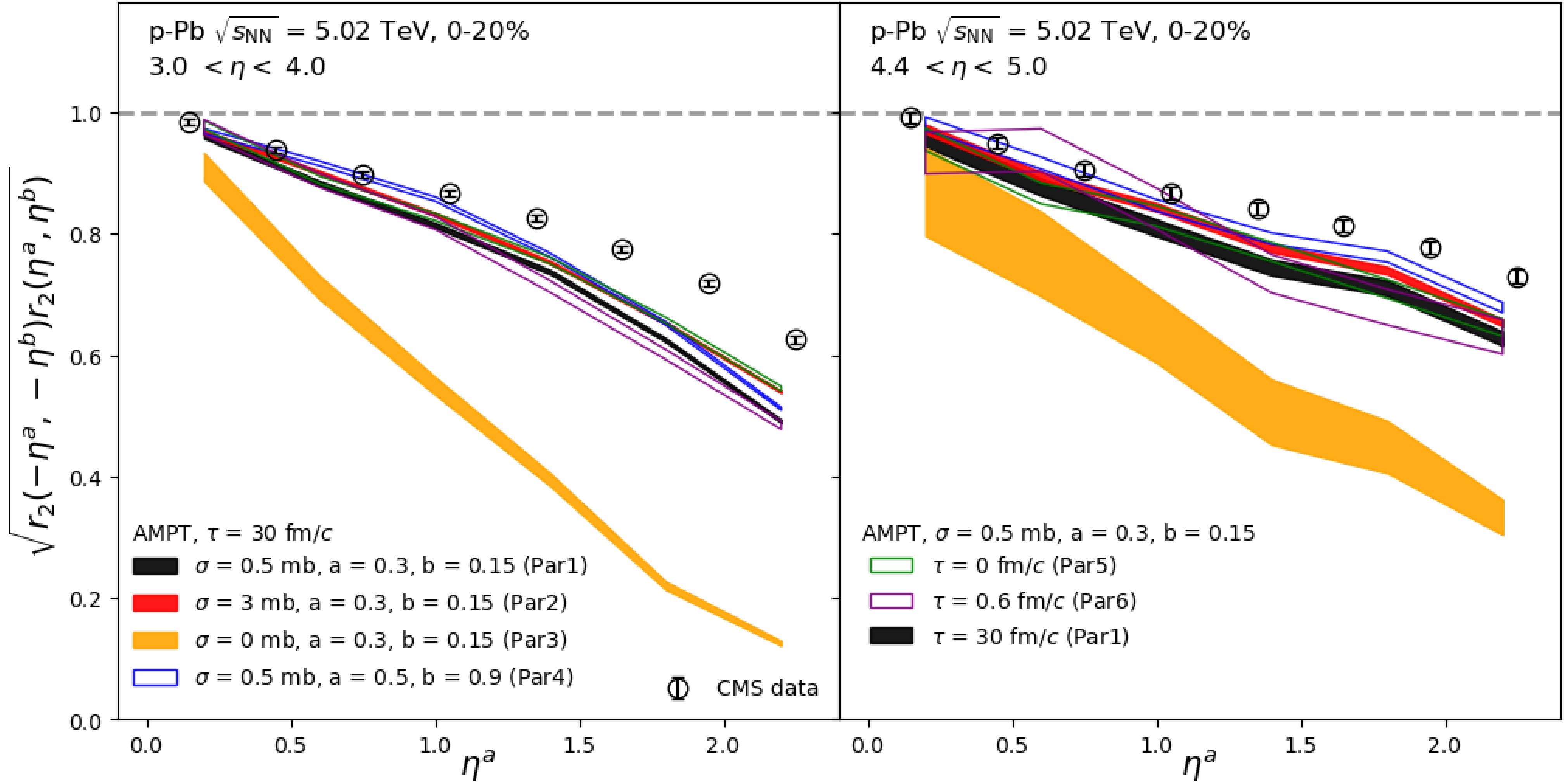 $\sqrt{r_{2}(\eta^{a},\eta^{b})r_{2}(-\eta^{a},-\eta^{b})}$ as a function of$\eta^{a}$ for 3.0$< \eta^{b} <$ 4.0 (left) and$4.4 < \eta^{b} < 5.0$ (right) in the 0–20% centrality class of p–Pb collisions at 5.02 TeV obtained from the AMPT model with various tunings. The CMS data points [42] are shown as black open circles for comparison.Figure 6 shows the