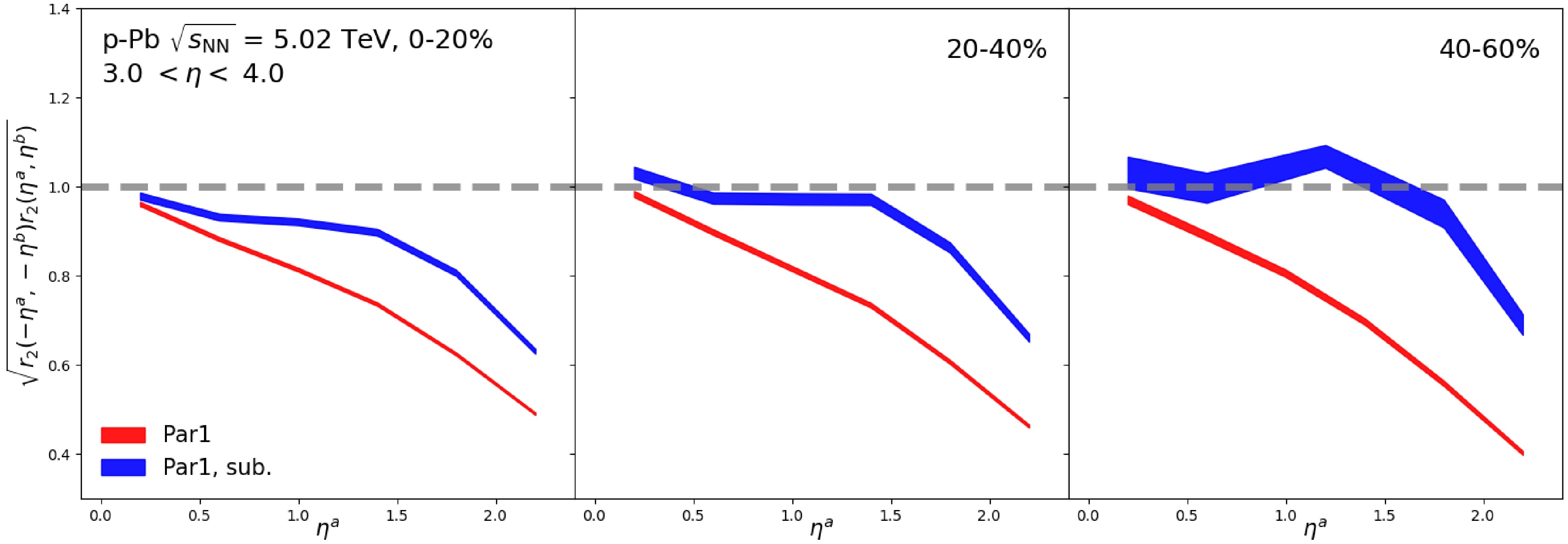 $\sqrt{r_{2}(\eta^{a},\eta^{b})r_{2}(-\eta^{a},-\eta^{b})}$ as a function of$\eta^{a}$ for 3.0$< \eta^{b} <$ 4.0 in p–Pb collisions at 5.02 TeV between before and after nonflow subtraction. The results in 0–20% (left), 20%–40% (middle), and 40%–60% (right) centrality classes are all shown. -