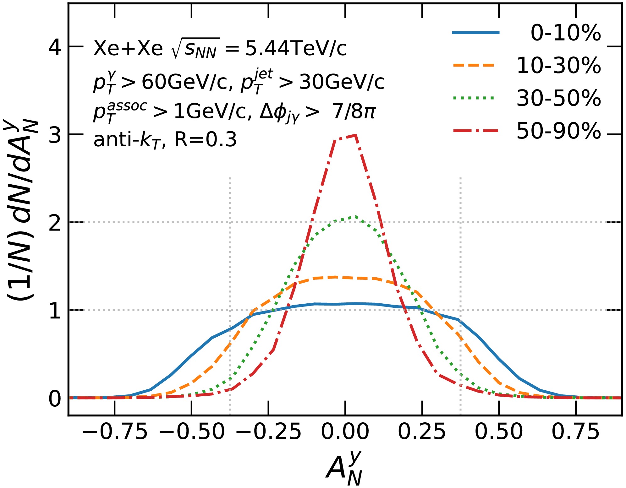 $ A_N^{y} $ ) distribution in Pb+Pb collisions across different centrality intervals. As shown in Fig. 2, our numerical results demonstrate the γ-jet production rates as functions of$ A_N^{y} $ for four centrality classes (0%−10%, 10%−30%, 30%− 50%, and 50%−90%) in Pb+Pb collisions at$ \sqrt{s_{NN}}=5.02 $ TeV. The$ A_N^{y} $ distribution exhibits greater broadening in central collisions compared with that in peripheral collisions. As the collision system transitions from central to peripheral configurations, the$ A_N^{y} $ distribution progressively narrows. This observation suggests that jets propagating parallel to the event plane show higher transverse asymmetry in central collisions than in peripheral collisions. In central collisions, jets traversing the QGP experience longer propagation paths, which lead to more pronounced jet quenching effects. These mechanisms lead to substantial medium-induced jet modifications, consequently producing more significant jet asymmetry.