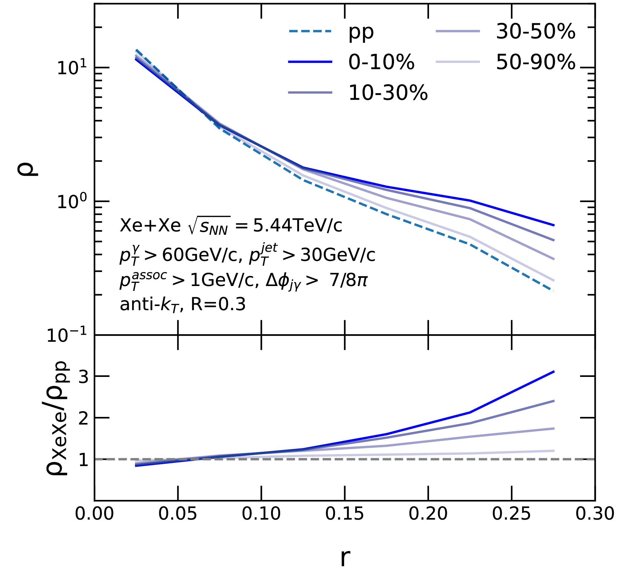 Figure 8. (color online) Upper panel: jet shapes as functions of r, from different centrality intervals—0%−10%, 10%−30%, 30%−50%, and 50%−90%—in Xe+Xe and p+p collisions at